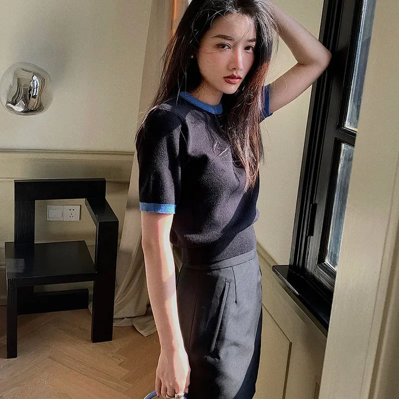 Damen Frühling Sommer Farbblock Patchwork Rundhals Kurzarm Gestricktes Crop Top Slim Fit Basis-Oberteil