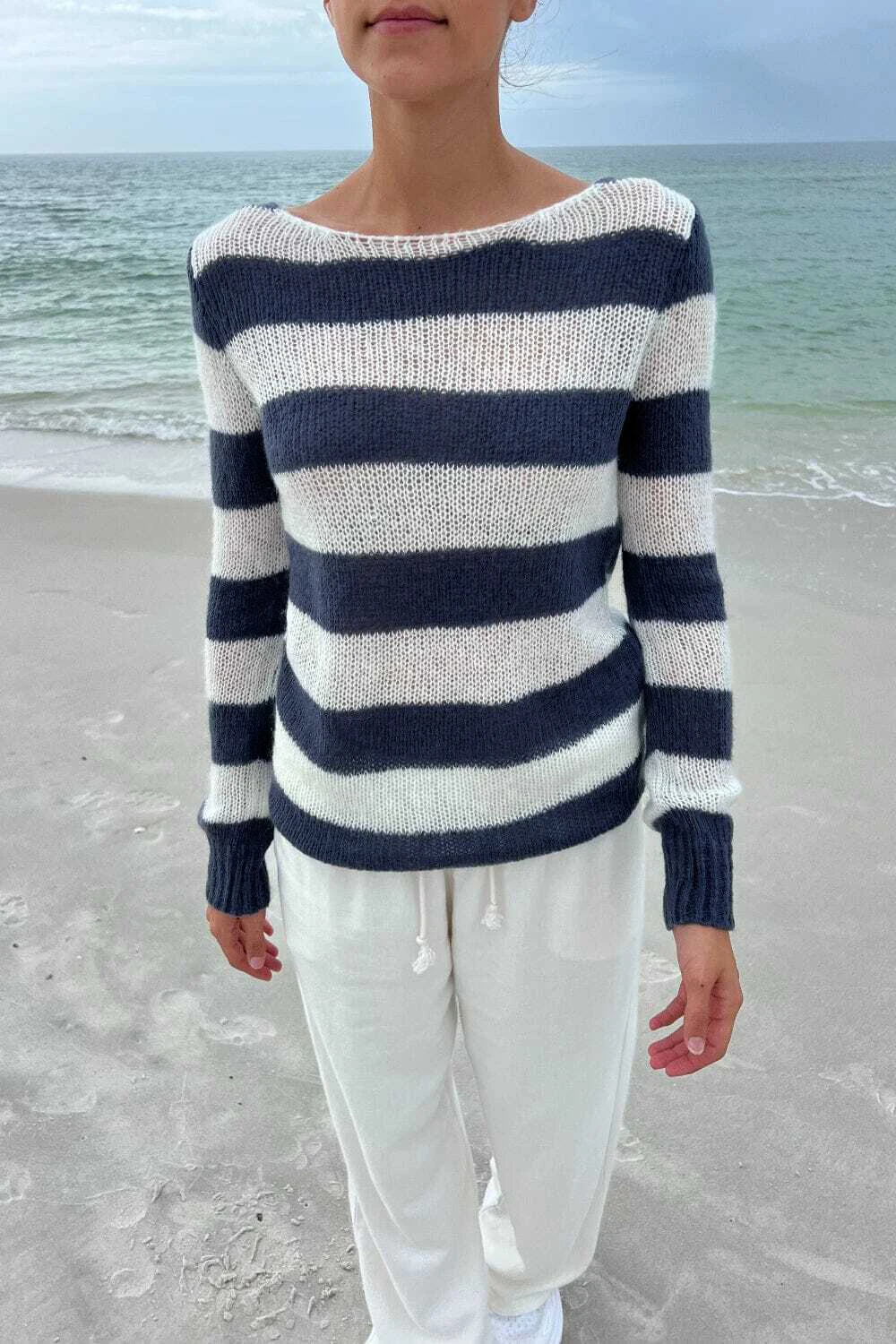 Damen Marineblau-Weiß Gestreifter Bootsausschnitt Transparenter Strickpullover Langarm Lässiges Strand-Oberteil