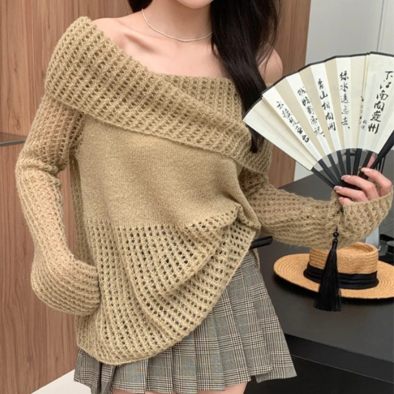 Frauen Top Pullover Pullover Gestrickte Off Schulter Volle Hülse Jumper Y2k Streetwear Elegante Stricken Casual Lose Herbst Winter