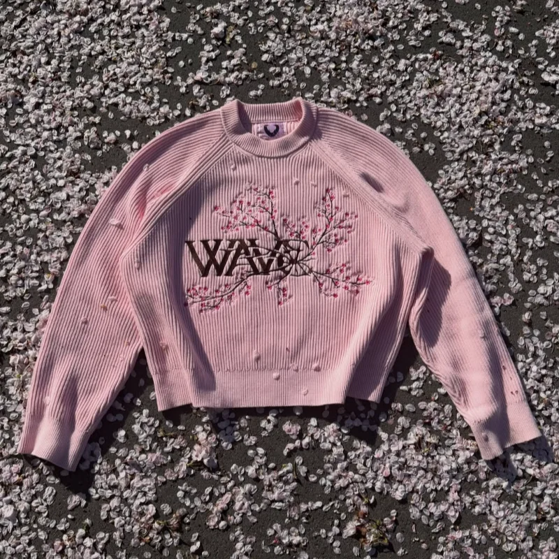 Y2K Vintage Harajuku rosa Crop-Pullover für Männer und Frauen, Strickpullover mit Kirschblüten-Stickerei, Modetrend, Streetwear, lässiges Oberteil