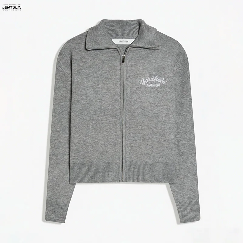Retro-Spliced Reißverschluss-Strickpullover Damen Mode Stehkragen Langarm Lose Kurze Strickjacke Y2k Buchstaben-Strickware