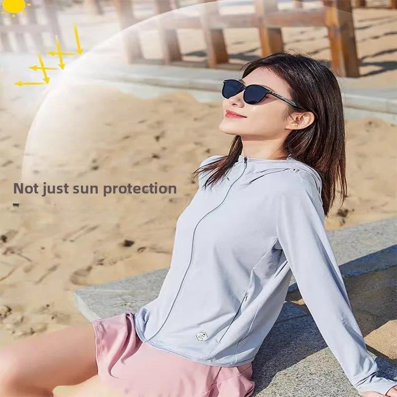 Damen Sommer Dünne Outdoor Atmungsaktive UV-Schutz Eisseide Kapuzenjacke aus Polyesterfaser – Modisch, Urban, Sportlich mit Reißverschluss