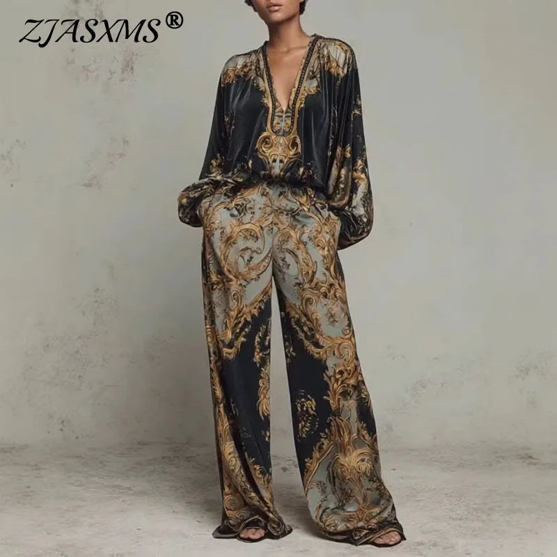 2-teiliges Set mit Retro-Muster, bedruckt, für Damen, sexy, tiefer V-Ausschnitt, Top, Blusen, elegantes Outfit, 2026, Frühling und Herbst, Hosenanzug mit weitem Bein