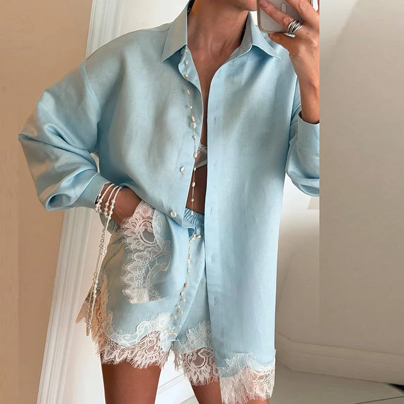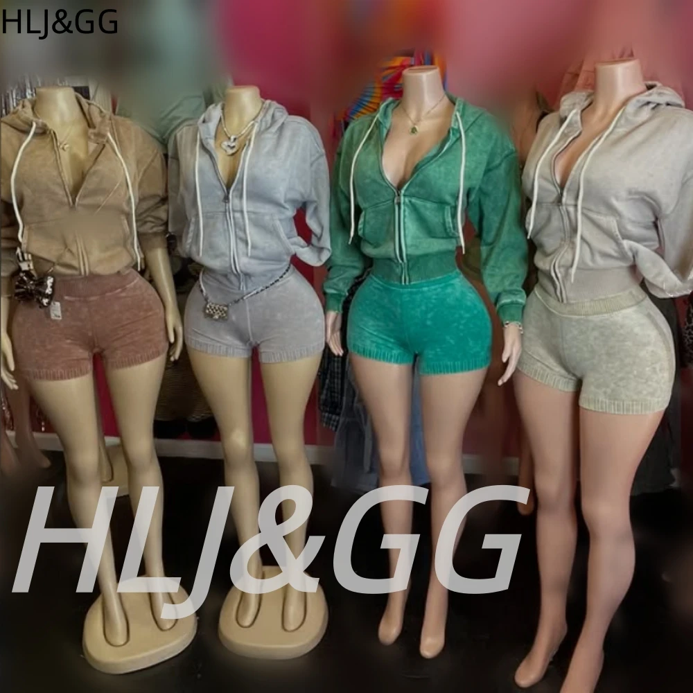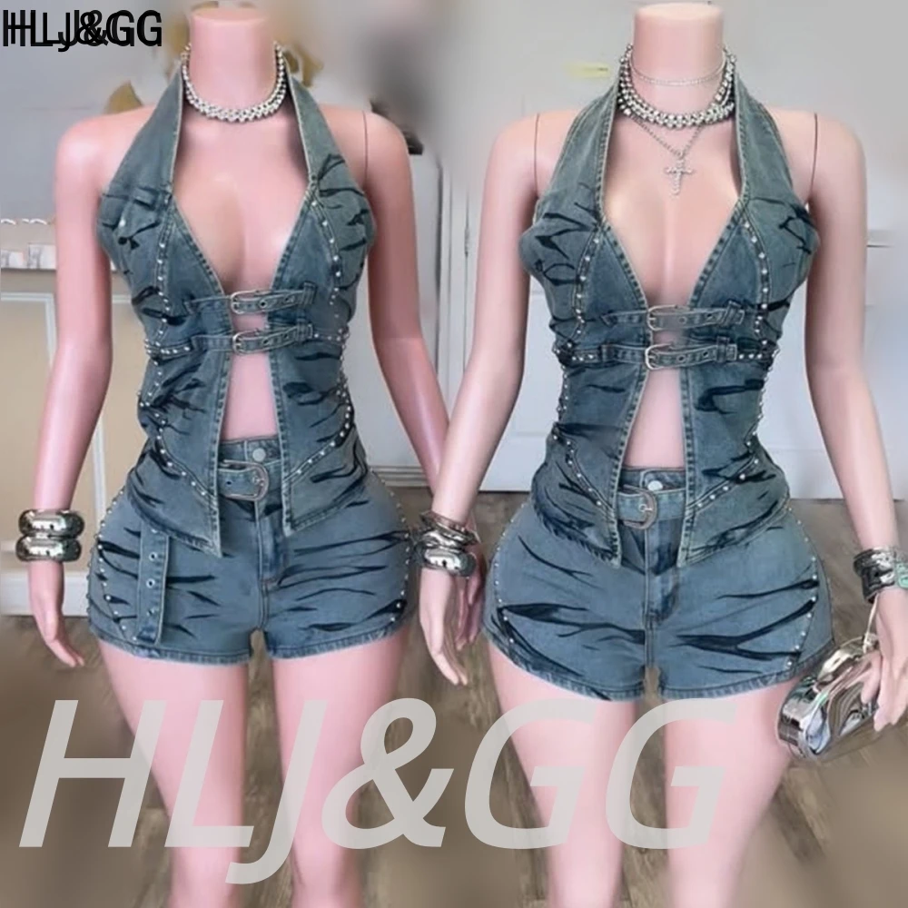 HLJ&GG Blaues Vintage-Denim-Set mit Aussparungen, zweiteiliges Damen-Outfit mit Neckholder-V-Ausschnitt, schmalem Crop-Top und Shorts, modische Cowboy-Streetwear