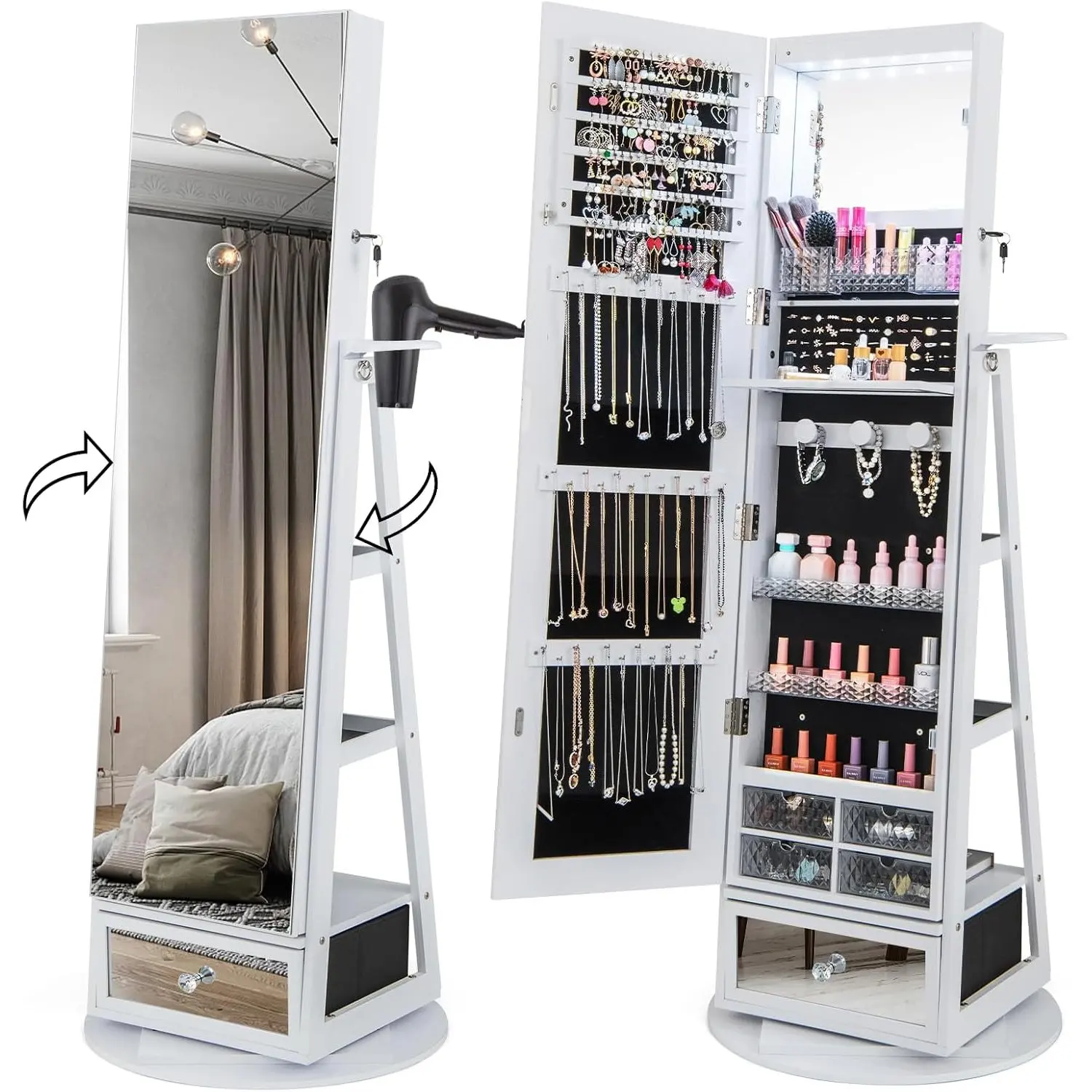 Schmuckschrank 360 ° Drehbarer Spiegelschrank mit Ganzkörperspiegel, LED-Beleuchtung & Schublade & Haartrocknerhalter