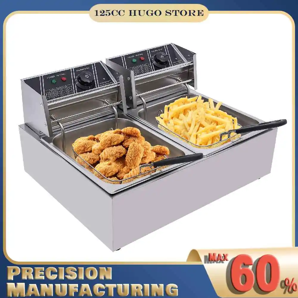 Kommerzielle elektrische Frittiermaschine aus Edelstahl, 220 V, 12 l, Doppelzylinder-Doppelsiebfritteuse, einstellbare Temperatur 60–200 ℃