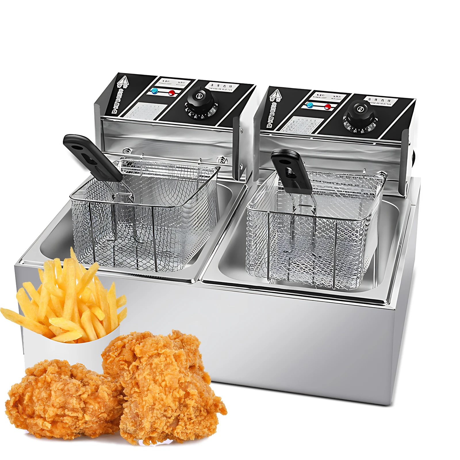 6L elektrische Doppeltank-Fritteuse mit abnehmbarem Ölfiltrationskorb und Deckel, 3,4 kW Edelstahl, automatischer thermostatischer Fisch