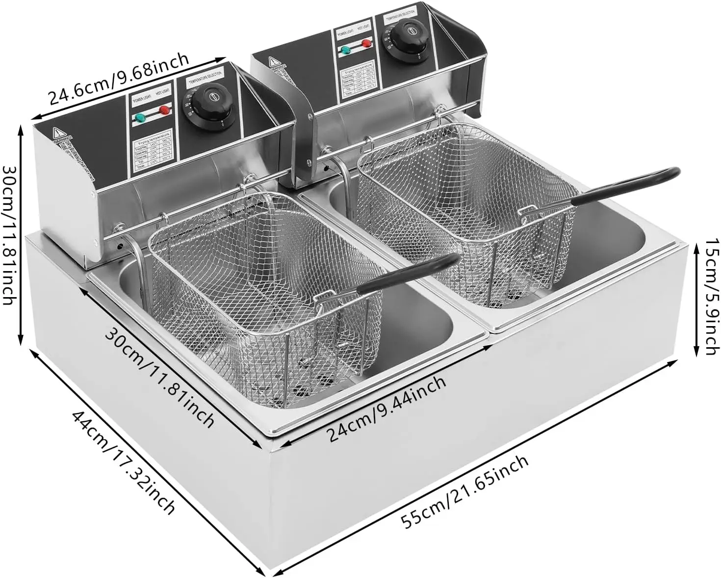 Doppeltank-Fritteuse aus Edelstahl, 2500 W, professionelle elektrische Fritteuse, Edelstahl, abnehmbarer Behälter, Thermostat 60–200 ° C