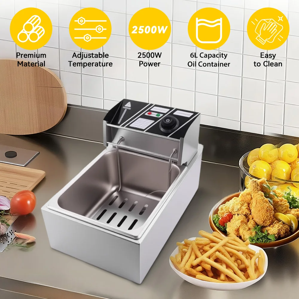 Professionelle 6L Fritteuse mit Thermostat | Elektrischer Schnellkochtopf für Pommes, Hühnchen, Donuts | Energiesparend, 2500W, Antihaft-Beschichtung, CE/GS | Ideal für Familie, Restaurant, Imbiss