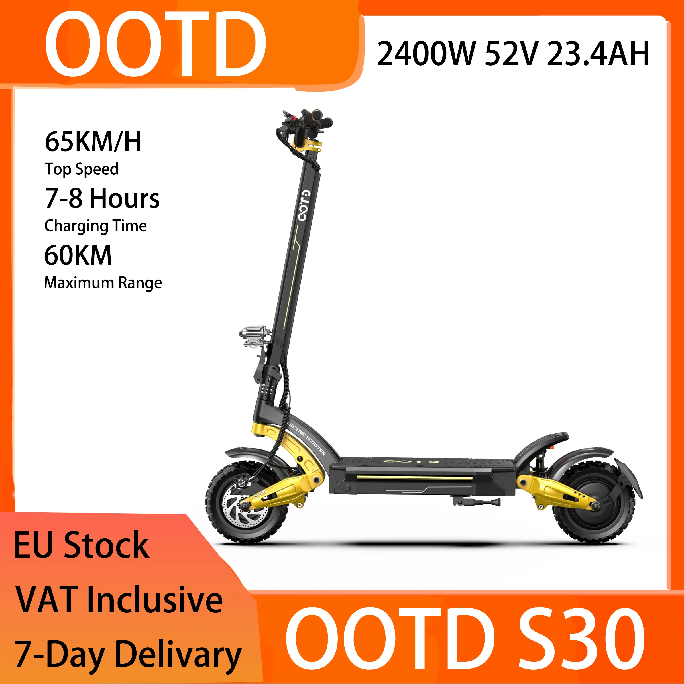 OOTD S30 Elektroroller für Erwachsene – Doppelmotoren, 2400 W Leistung, Höchstgeschwindigkeit 65 km/h, Reichweite 60 km, 10-Zoll-Reifen, Doppelfederungssystem.