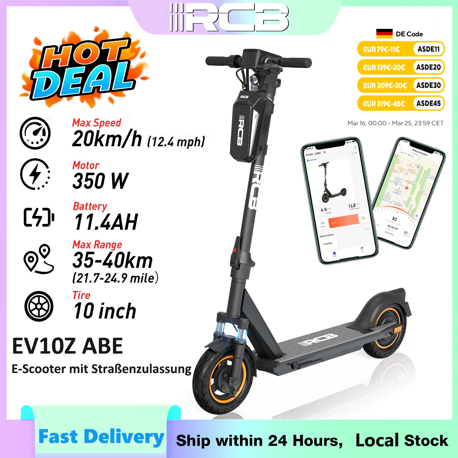 RCB 350W Elektroroller für Erwachsene EV10Z ABE, 20 km/h Höchstgeschwindigkeit, 35 km Reichweite Elektroroller mit Straßenzulassung, Doppelbremse Wasserdichter faltbarer E-Scooter, 10-Zoll-Wabenreifen 120 kg Tragkraft