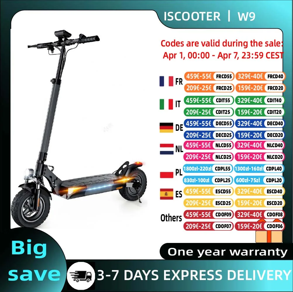 iScooter W9 Elektroroller für Erwachsene, 1000 W Motor, 54,6 V, 14 Ah Akku, 10 Zoll Off-Road-Luftreifen, faltbarer E-Scooter