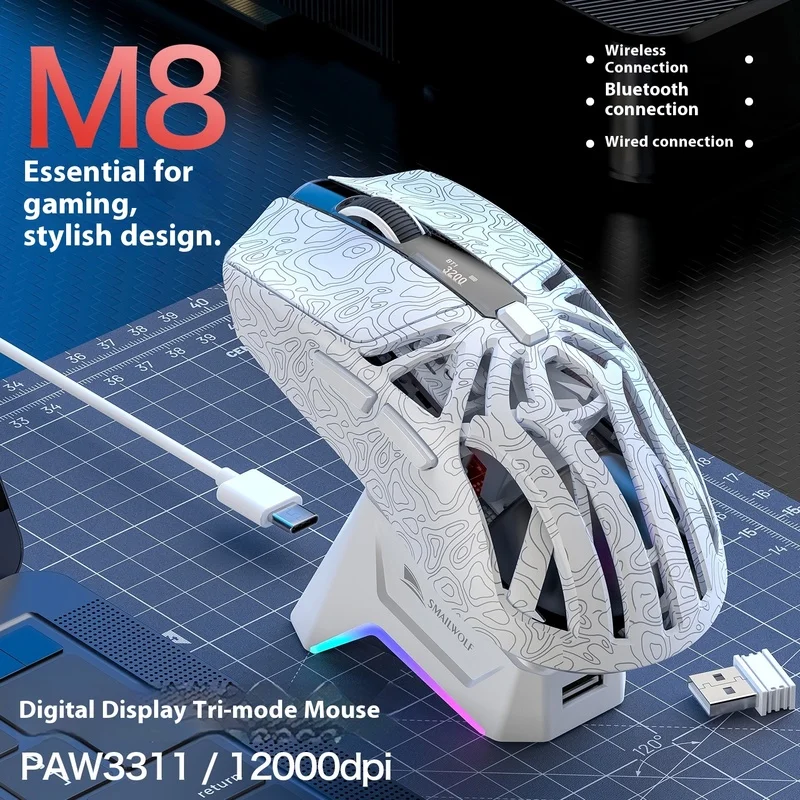 SmileWolf M8 Gaming-Maus, leicht, für Bürocomputer, Bluetooth, PAW3311, Dreifachmodus-Wireless-Controller für Gaming und Büro