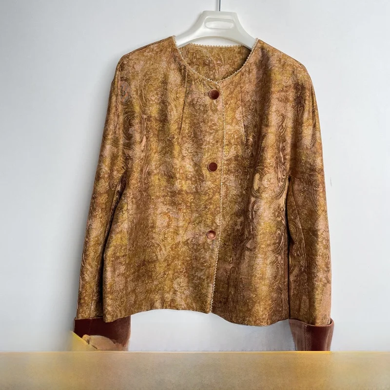 Modische Schlankmachende Retro-Print Rundhals-Jacke Damen-Oberteil Frühling 2026 Knopfverzierte Nylon-Stoffjacke