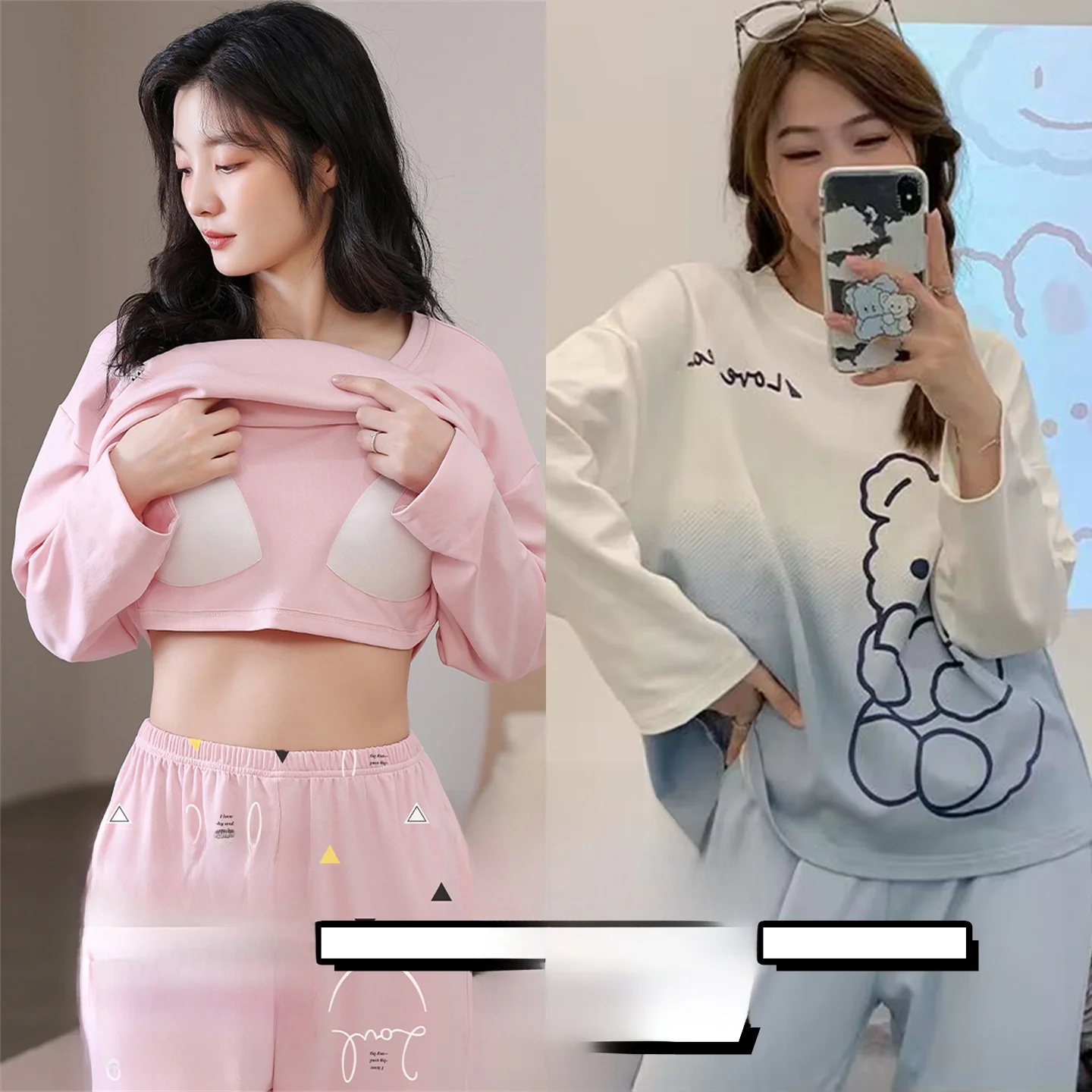 2026 Neue Baumwoll-Schlafbekleidung für Damen mit Brustpolster, Langarm-Hauskleidungsset aus weicher Polyesterfaser, Rundhals, gerader Schnitt