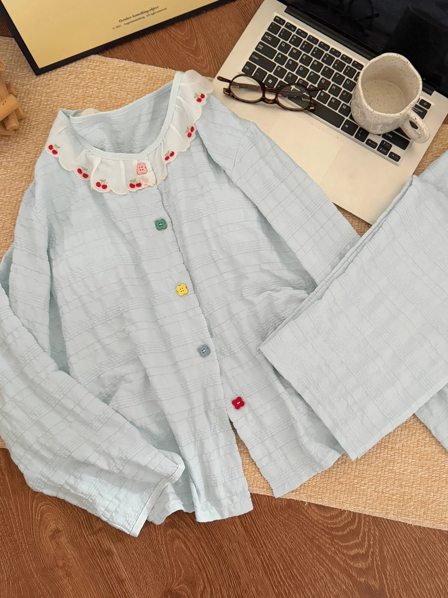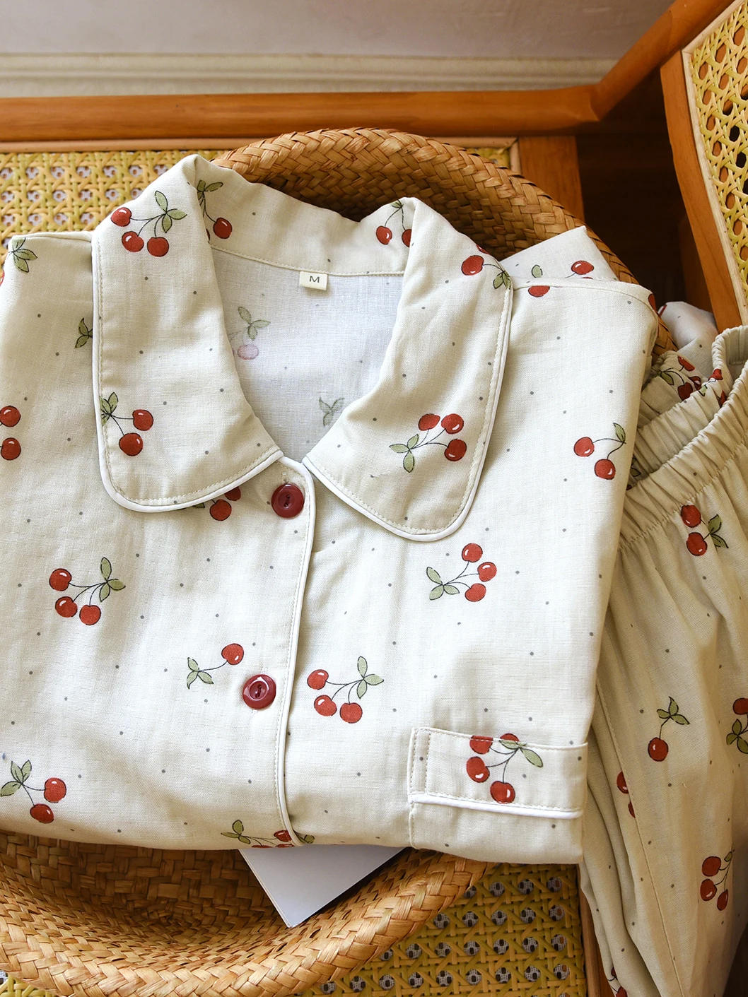 Reine Baumwolle, langärmlig, quadratischer Kragen, Kirschdruck, Heimkleidung für Damen, bequem, leicht, für Frühling und Sommer