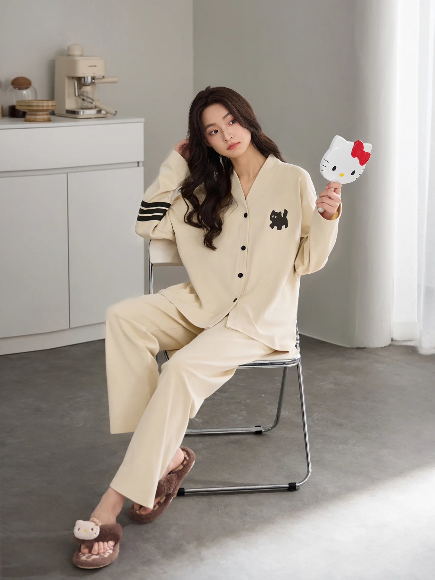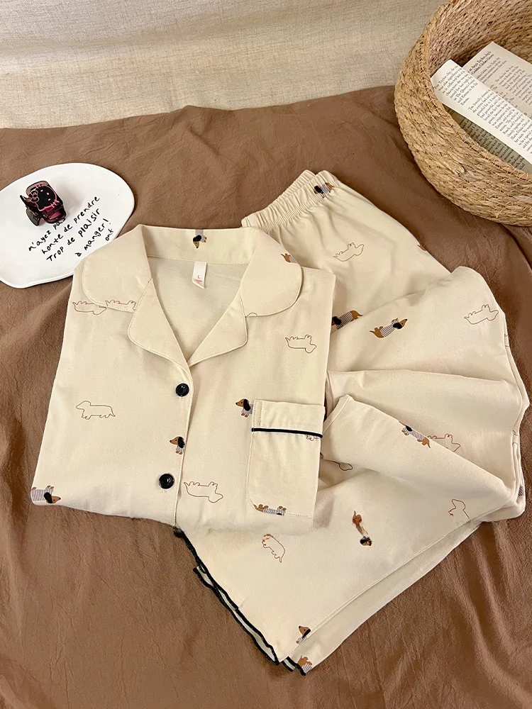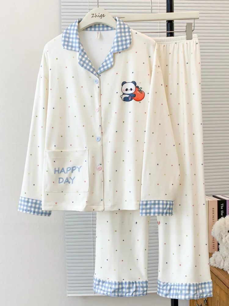 Niedliches Cartoon-Baumwoll-Schlafanzug-Set für Damen mit Langen Ärmeln für Frühling, Herbst und Winter, Bequemes Weiches Polyestergewebe