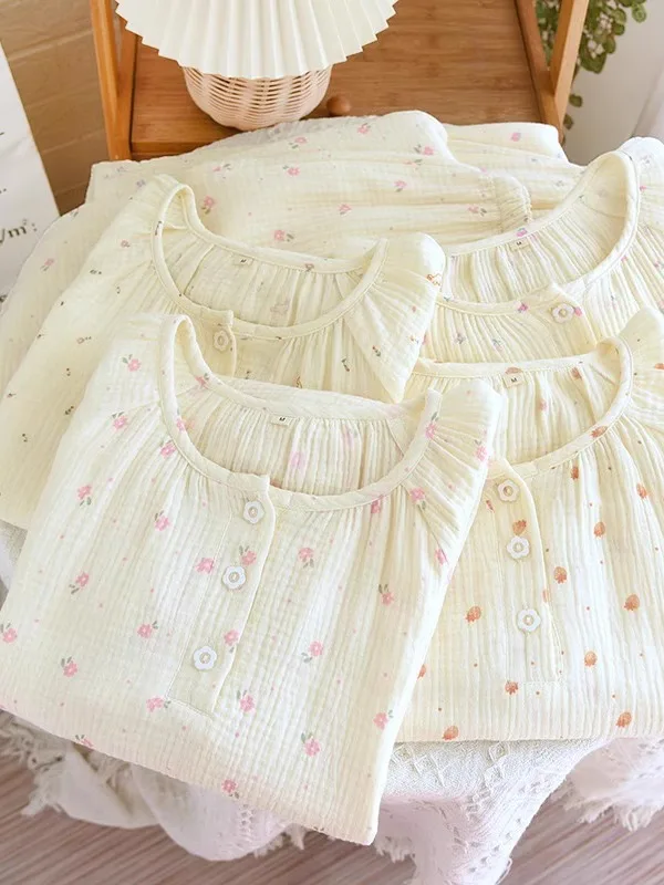 Reine Baumwolle Bubble Cotton Rundhals Langarm Süßes Blumenmuster Freizeitkleidung Set für Damen Geeignet für Draußen...