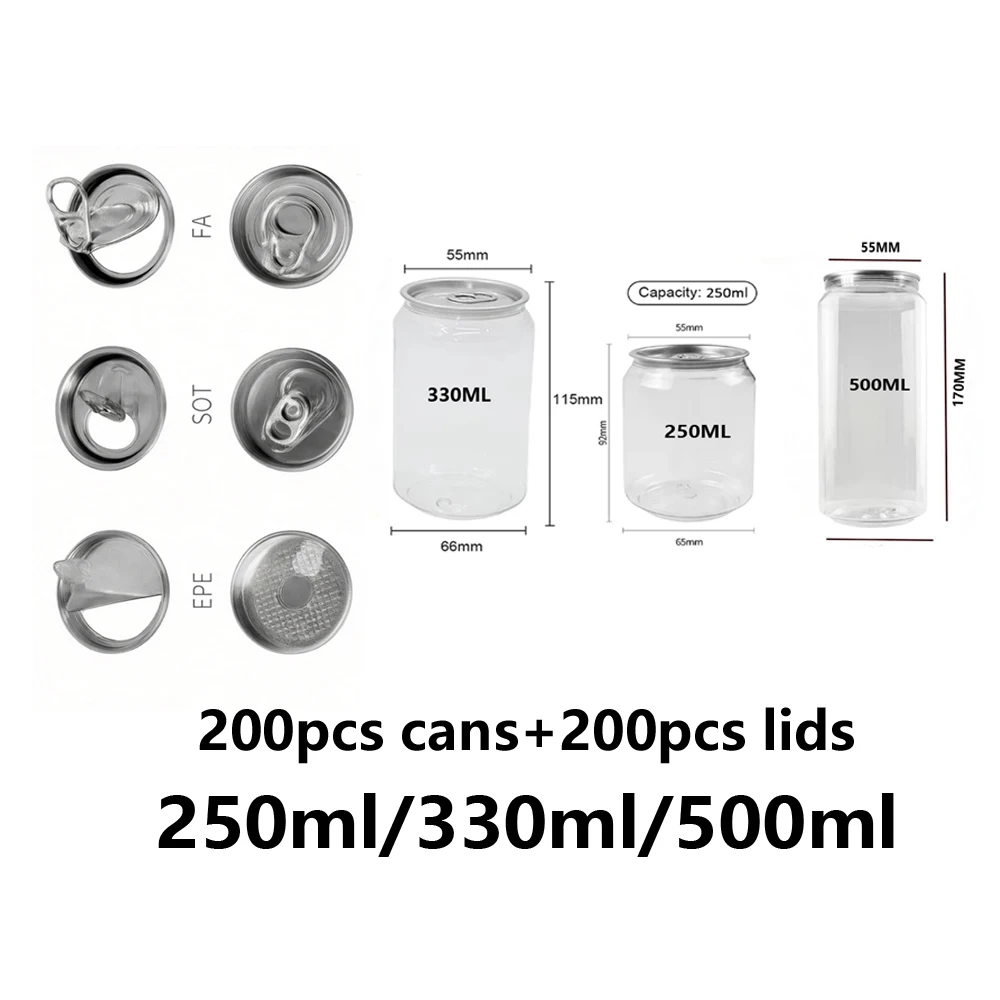 200 Stück transparente PET-Plastikflaschen in Lebensmittelqualität, leer, 250/330/500 ml, für Kaffee/Bubble Tea/Milchtee-Dosen mit Deckel