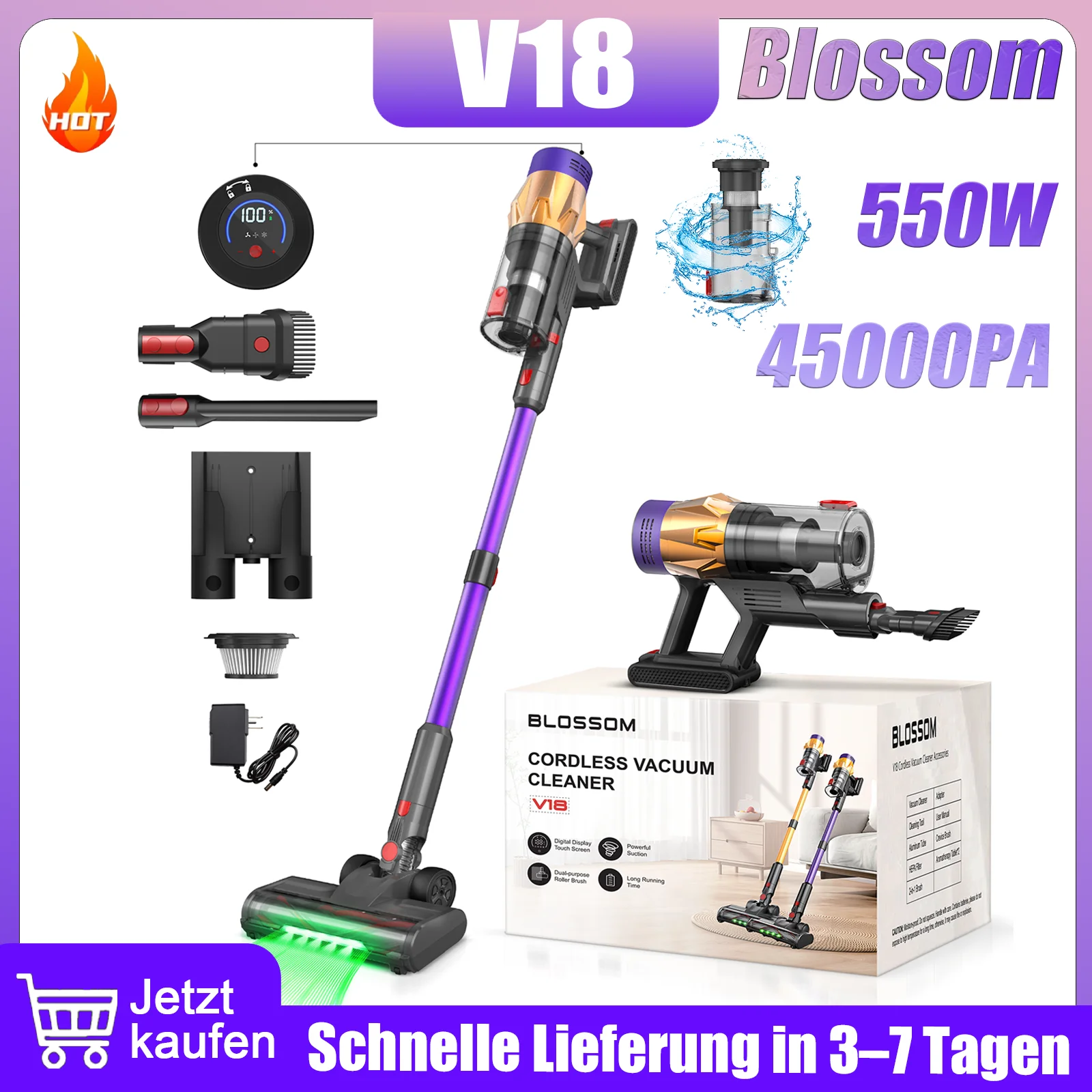 Kabelloser Staubsauger 62KPA/70min, 6-in-1 Handstaubsauger mit LED-Anzeige, aufrechter Stabstaubsauger, Technologie zur Erkennung grüner Staubpartikel.
