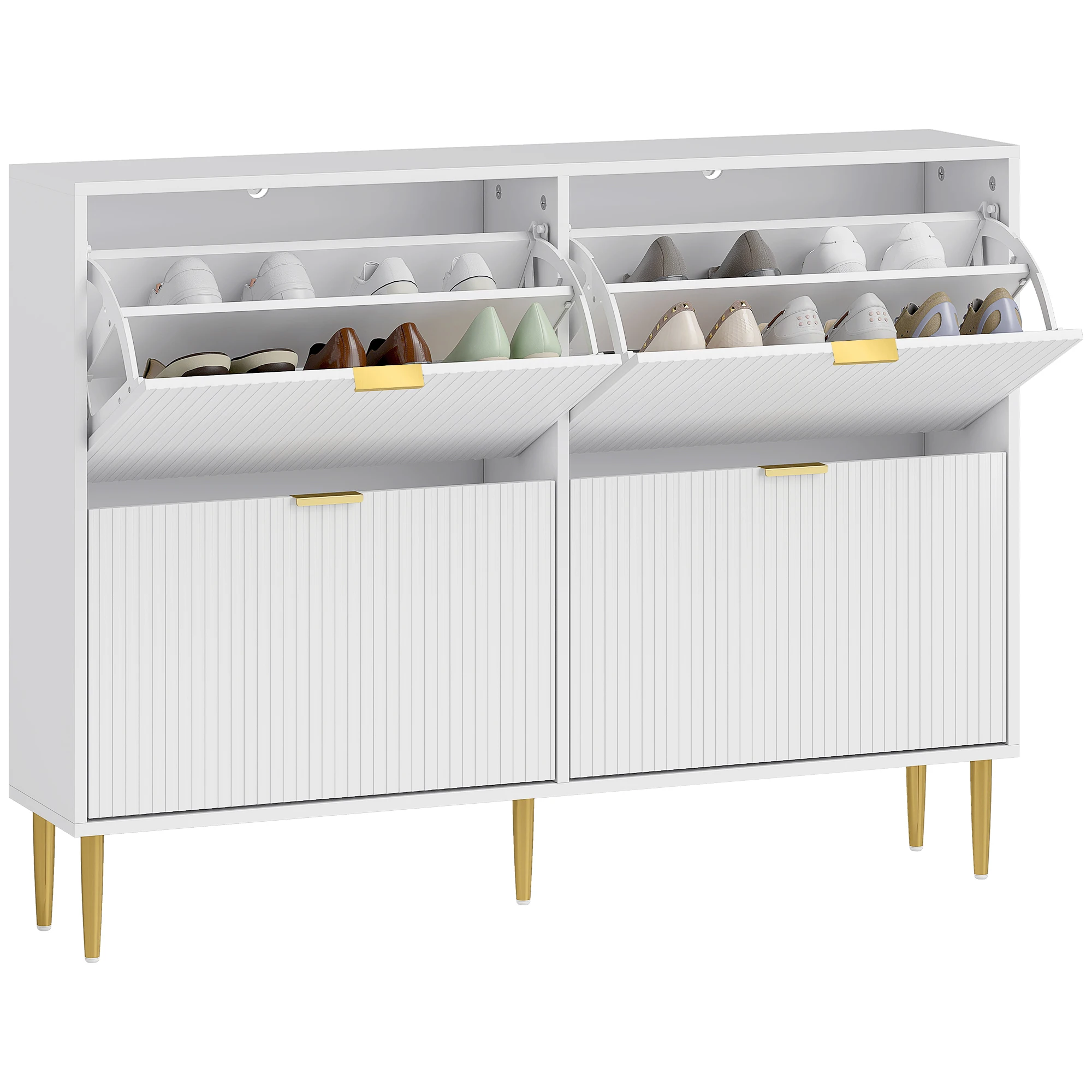 Schmales Schuhregal mit gerippten Türen und verstellbaren Regalen für Paar Schuhe in Weiß