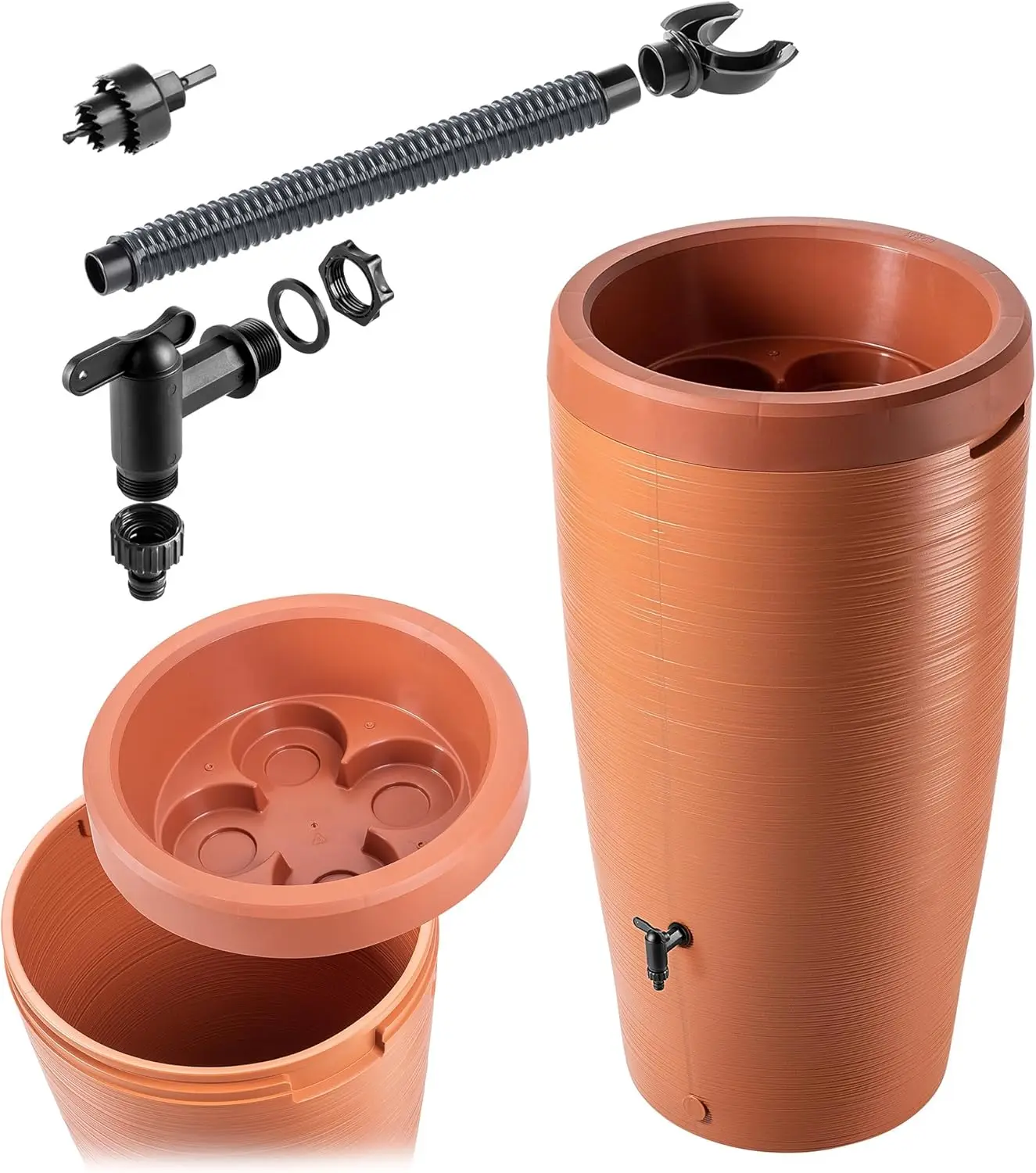 Regenton mit integrierter Pflanzschale im Deckel, 240 L, Regenfass aus Kunststoff, Regenwasserbehälter mit Wasserhahn