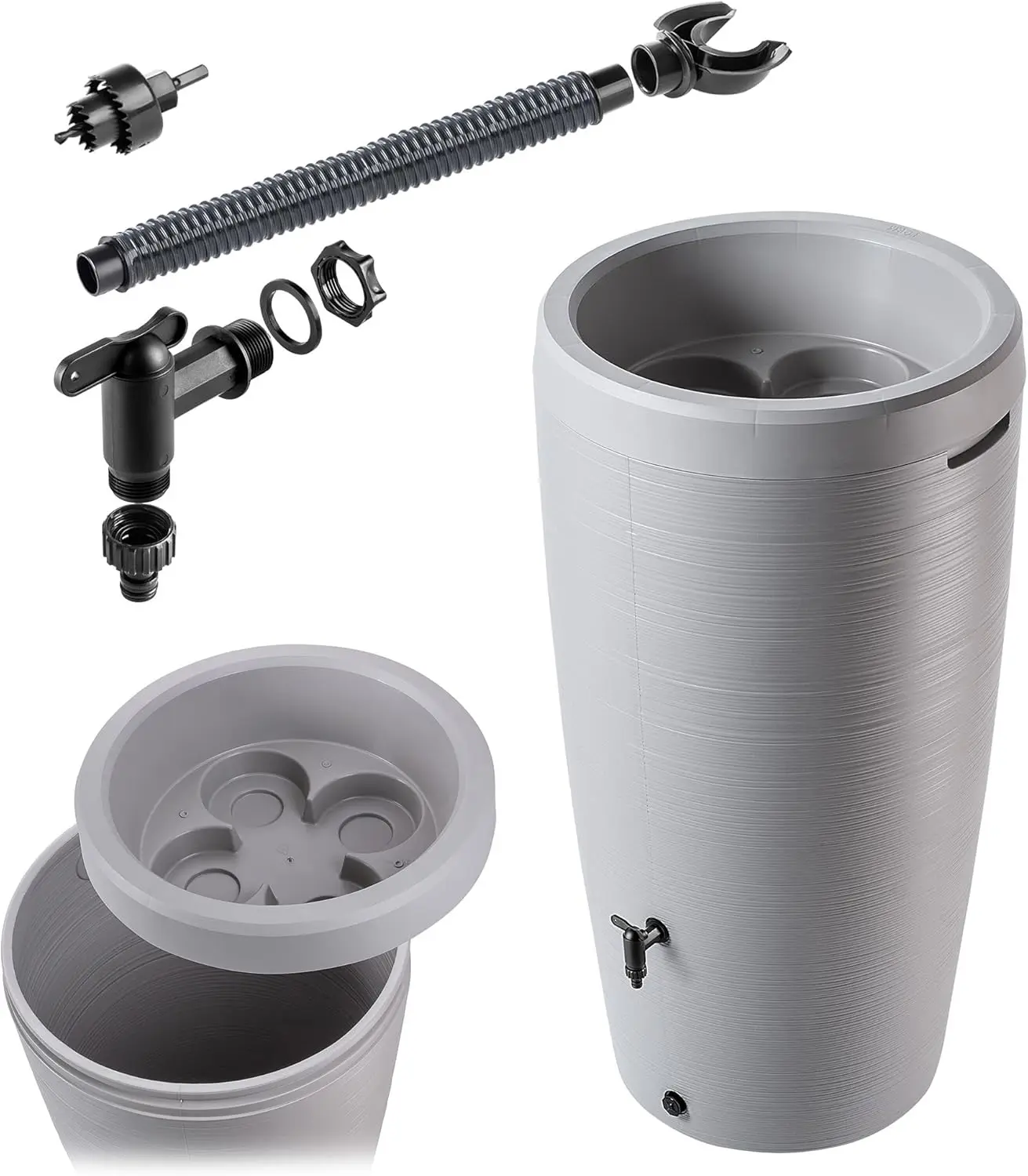 Gartenfass inklusive Verschluss und Ablaufschlauch, 220 Liter, aus recyceltem Kunststoff, wetterfest und stabil für den Garten