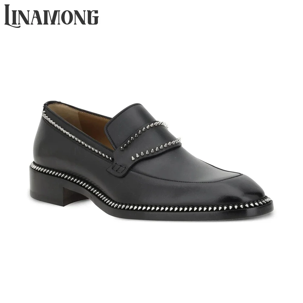 Schwarze Spike-Loafer mit Mandelspitze und silberfarbenen Nieten, Lederschuhe im Designer-Stil, handgefertigte Schuhe für Herren, Slip-On-Loafer mit Mandelspitze