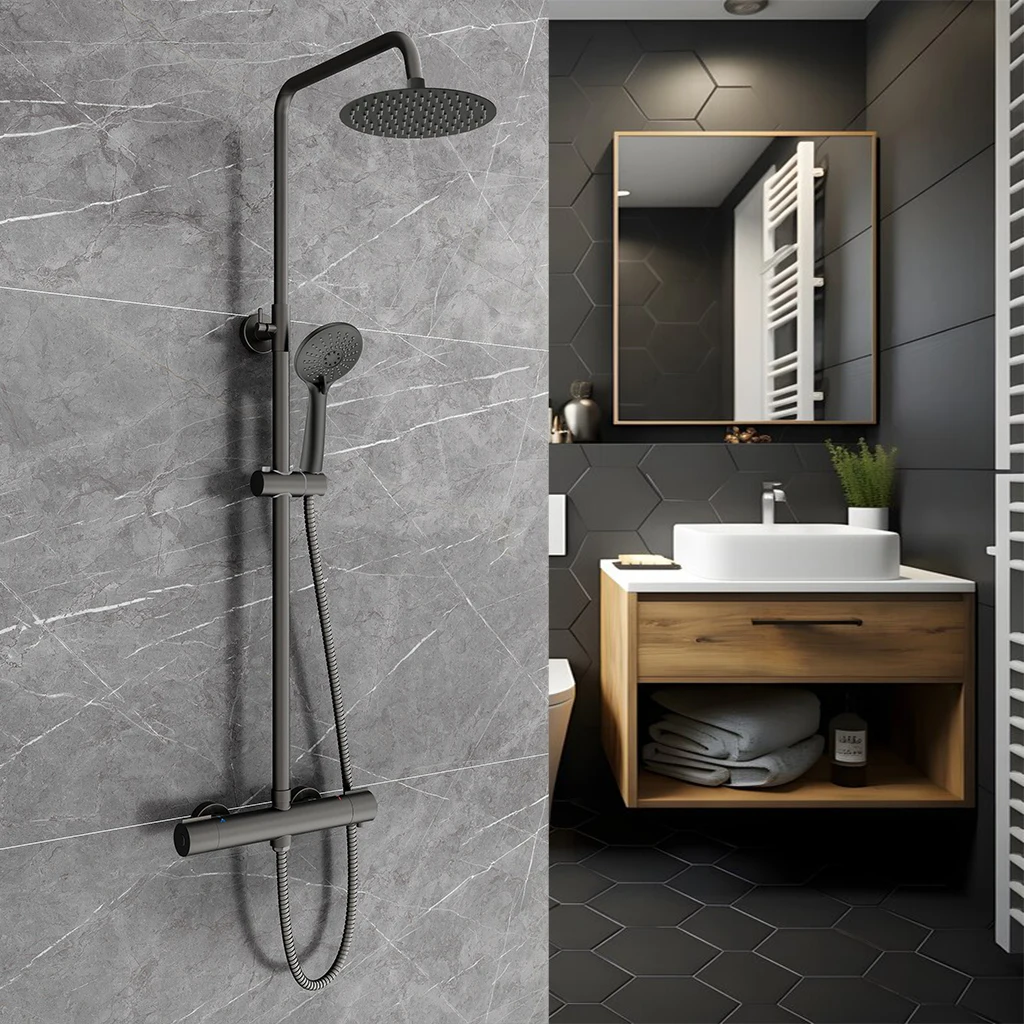 20 x 20 cm runder Duschluftkopf aus Edelstahl, Duschsäulen mit Thermostatmischer und 3 Duschfunktionen, mattschwarz
