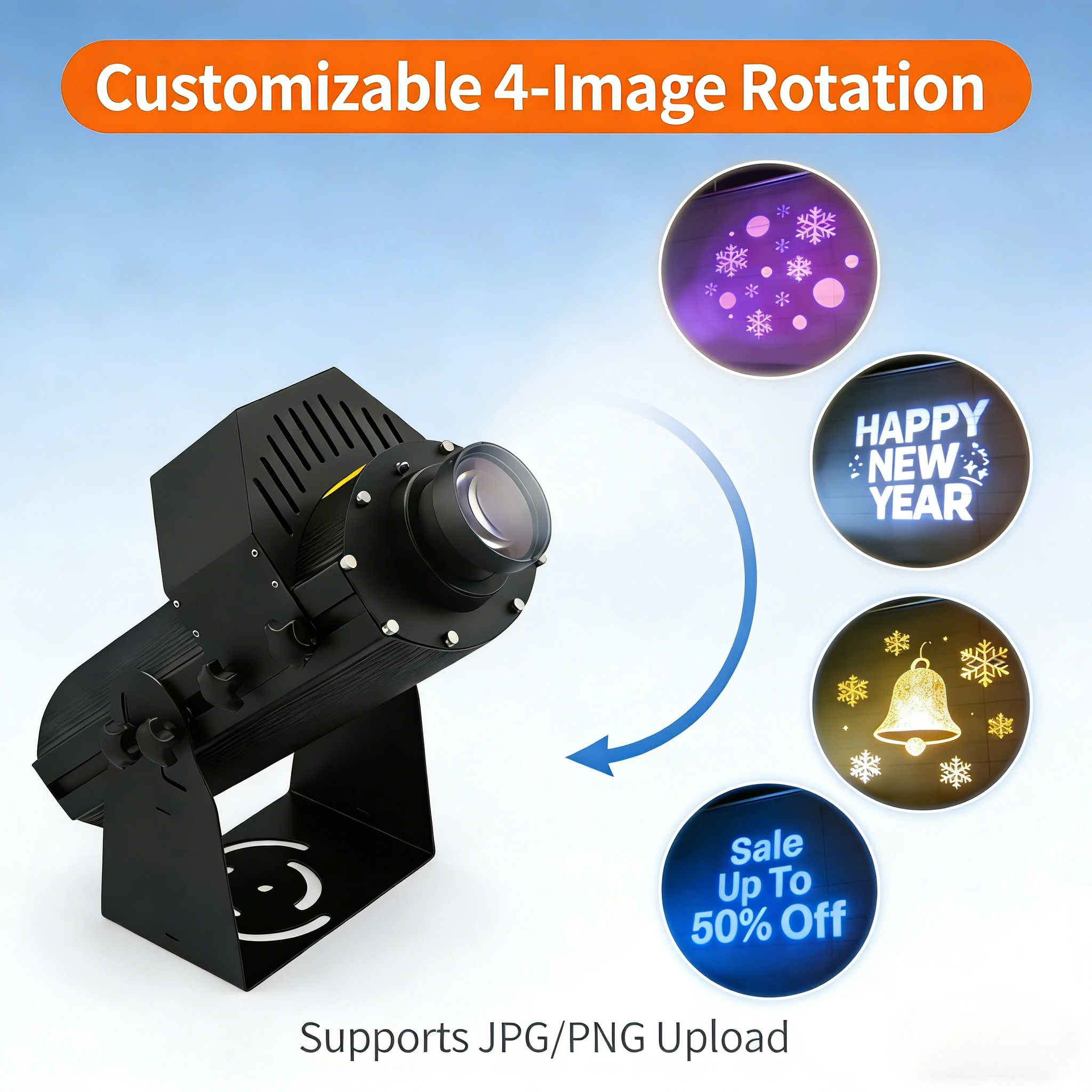100/150/200 W LED-Logo-Projektor für den Innenbereich, 4 rotierende Muster und individuelle Designs, perfekt für Café, Restaurant, Bar, Hochzeitsveranstaltungen