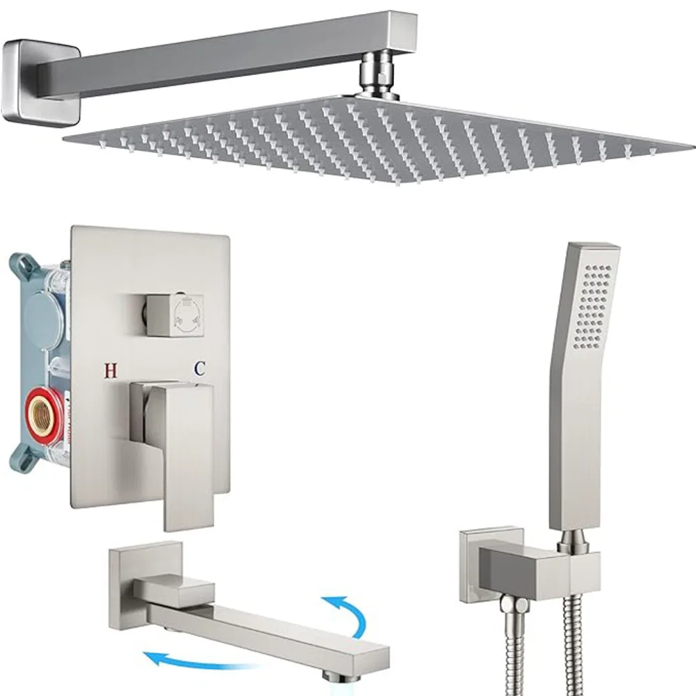 CUPC Schwarzer, komplett aus Kupfer gefertigter, quadratischer, bündig montierter, verdeckter Wandduschkopf, Regenduschsystem mit konstanter Temperatur, 3-Funktion