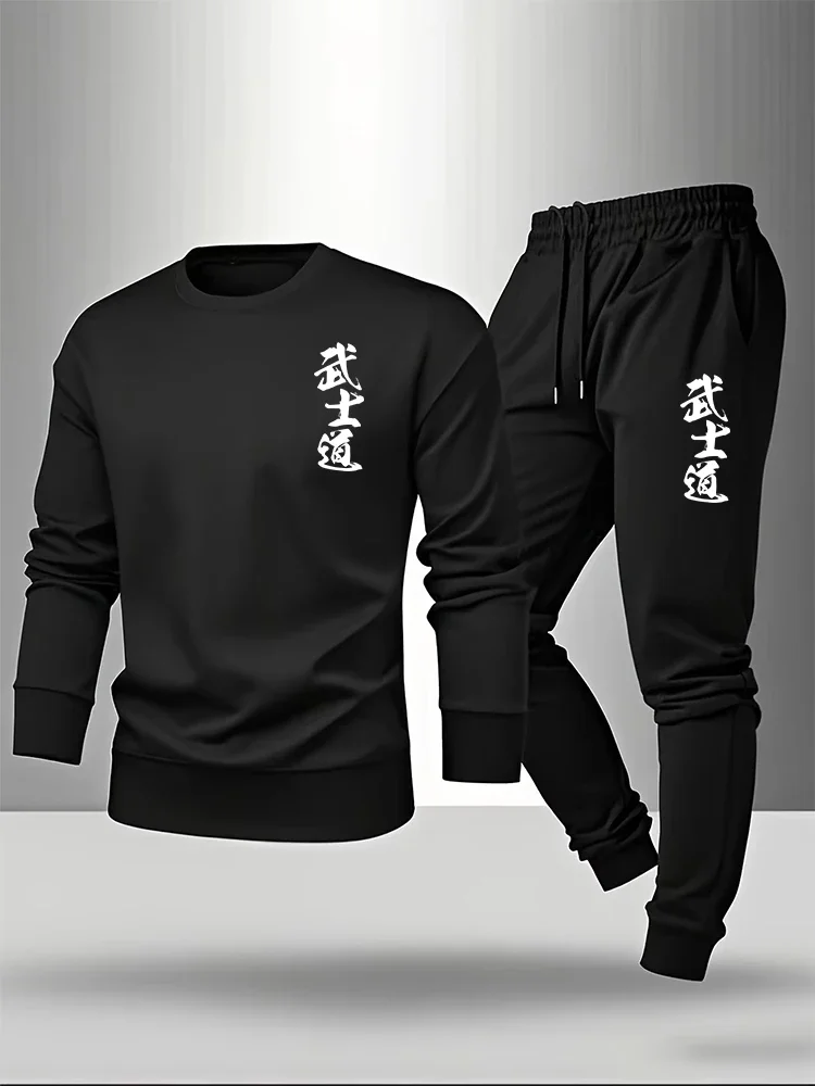 Japan Bushido Print Herren-Set mit O-Ausschnitt Hoodie und Jogginghose – Lässiges, warmes Pullover-Outfit für Frühling und Herbst – Einzelner Sweatshirt oder Hose