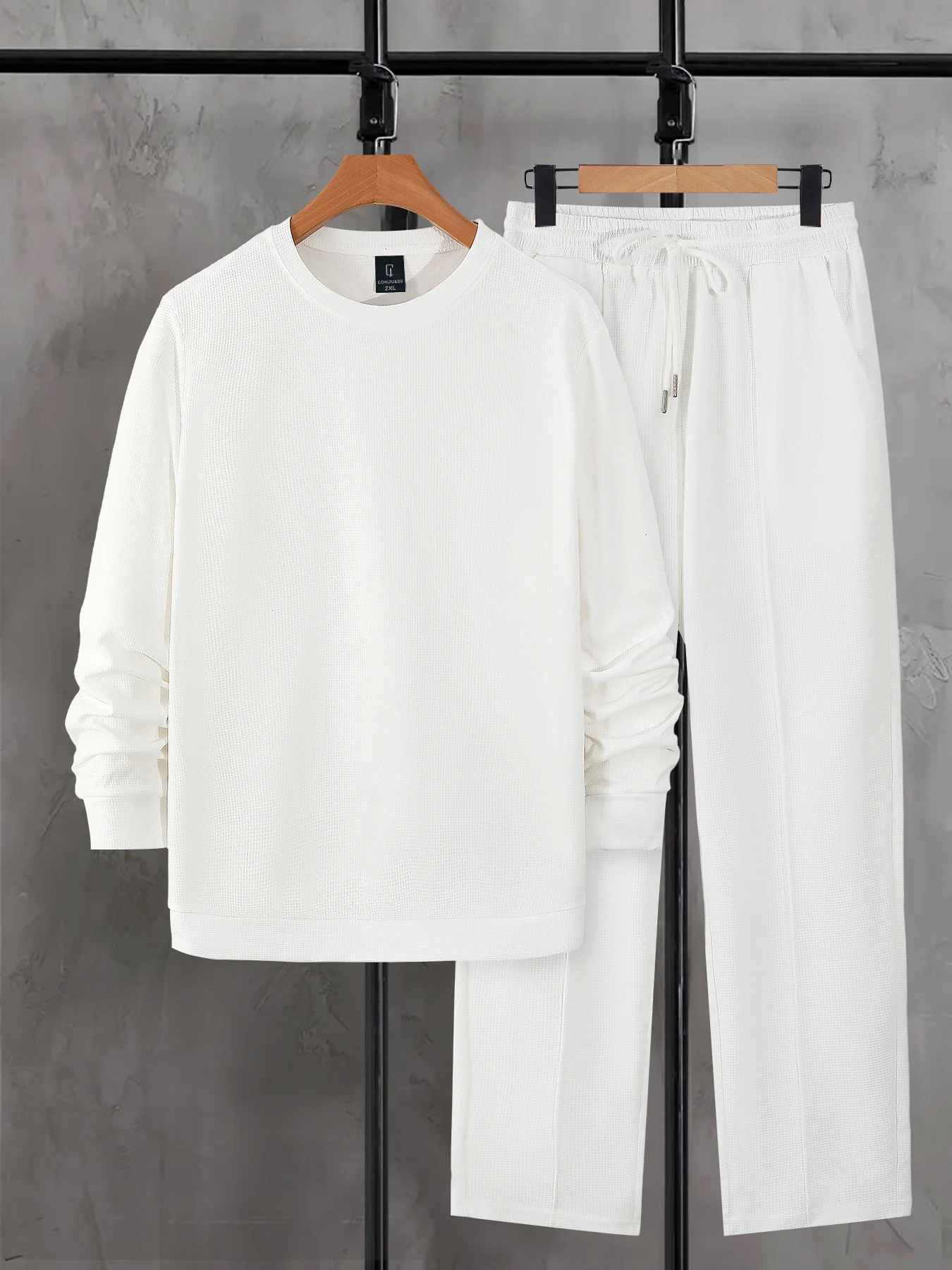 Herren Übergrößen Waffel-Sweatshirt-Set Oversized Rundhals Langarm & Gerade Hose mit Kordelzug 2-teilig
