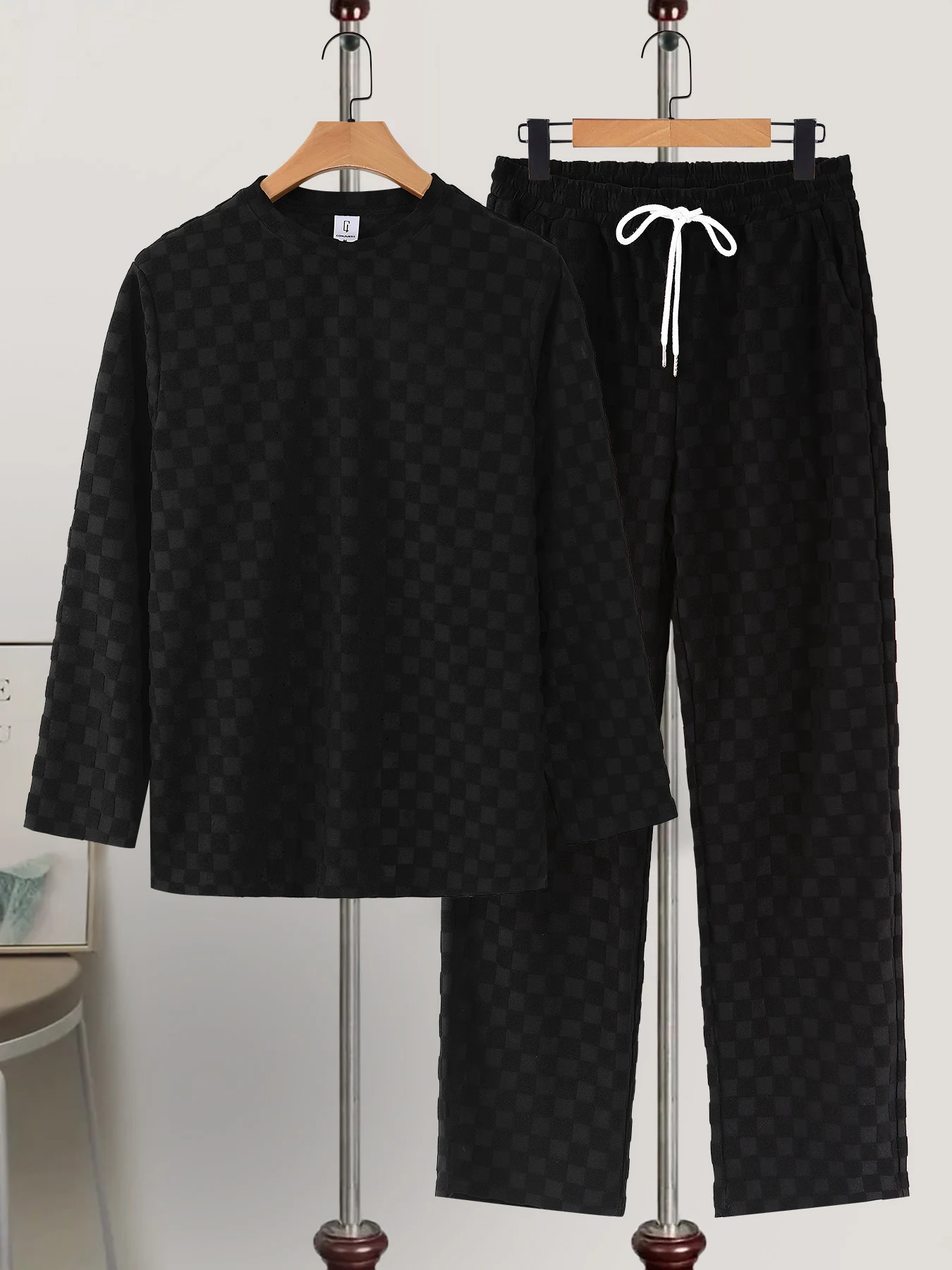 Herren Schachbrettmuster Rundhals Langarm-Set Frühling Herbst Locker Lässig Heim-Sport 2-Teiliges Outfit