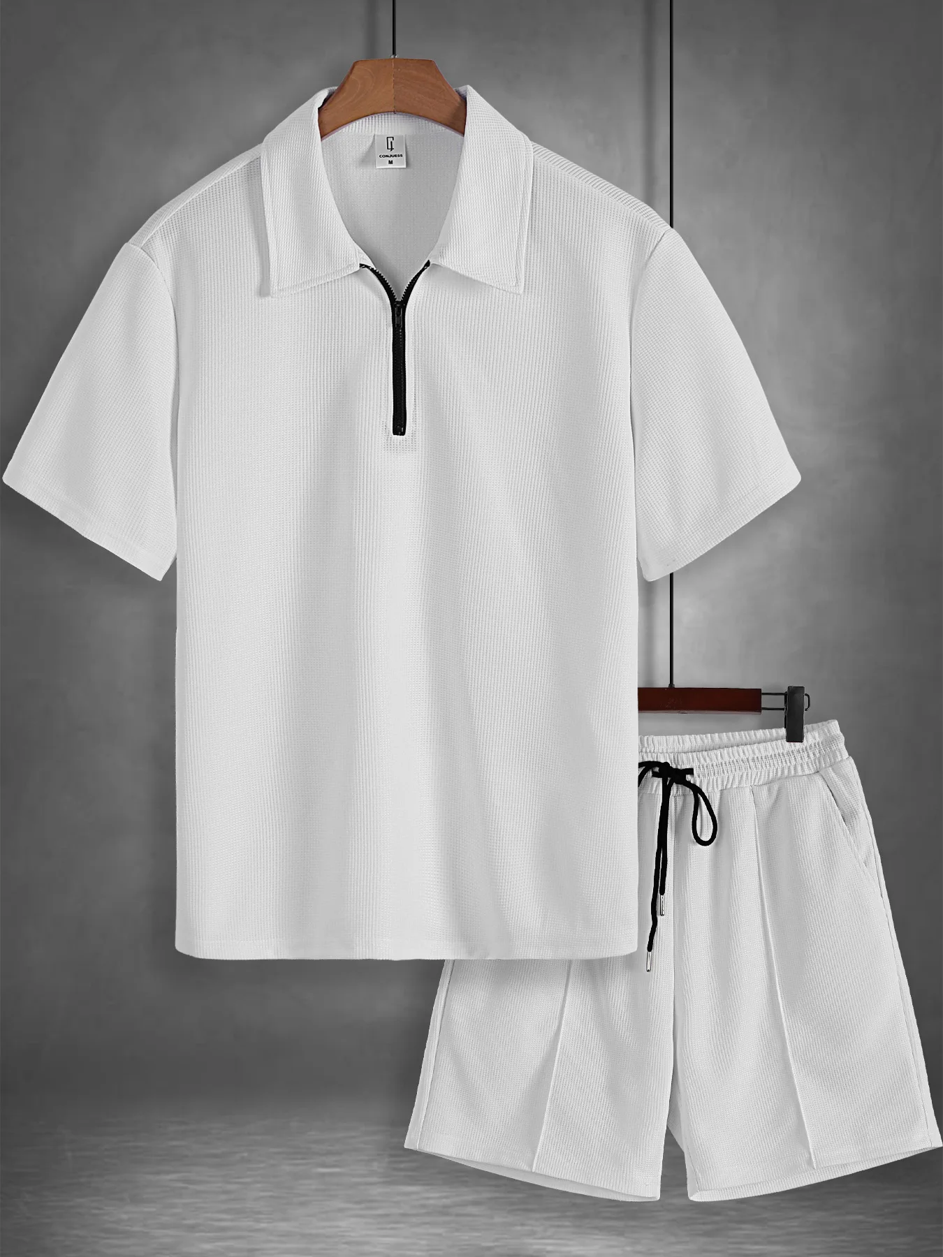 Herren Weißes Waffelstrick-Poloshirt mit Halbem Reißverschluss, Lässiges 2-Teiliges Set mit Kragen, Kurzen Ärmeln & Shorts mit Kordelzug