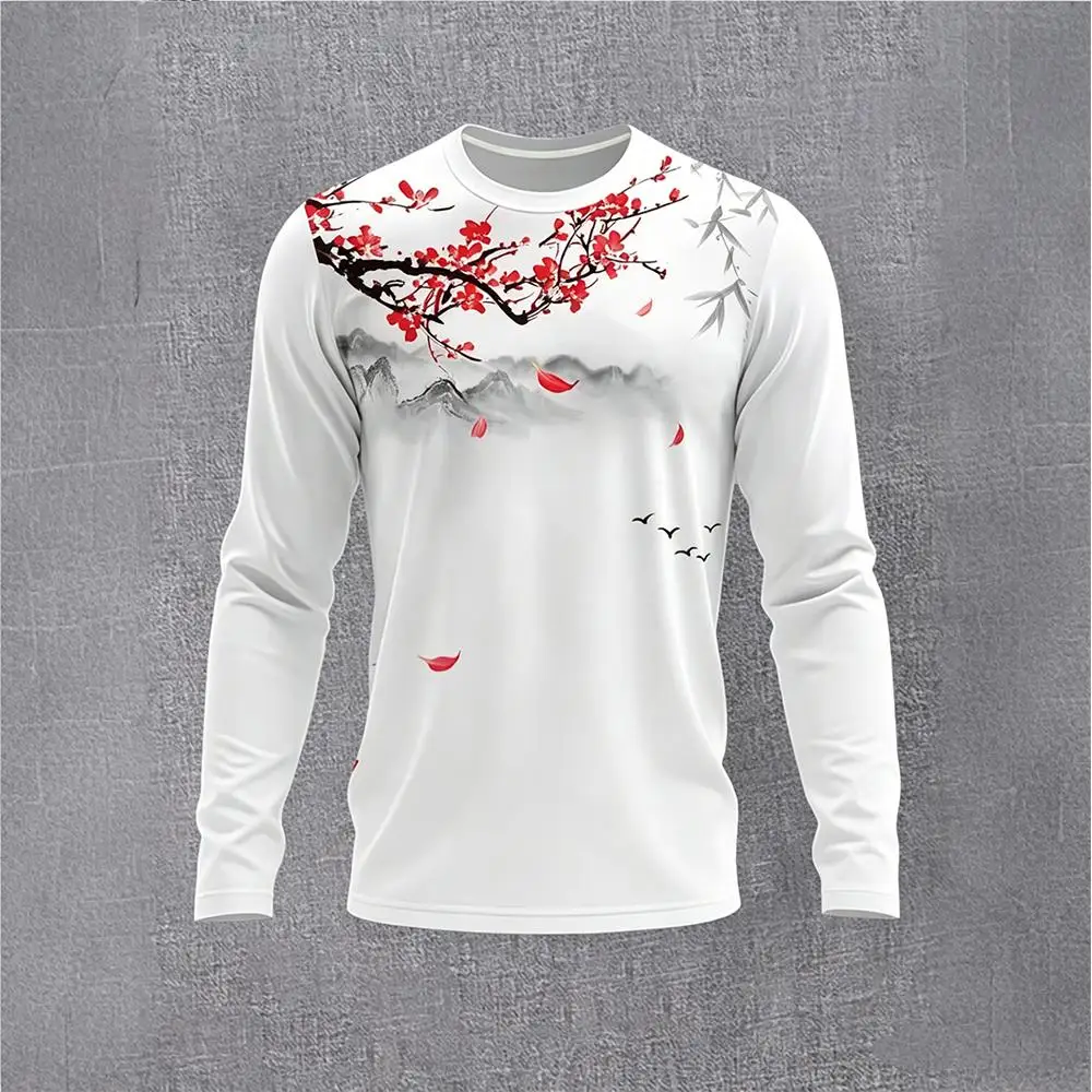 Langärmliges T-Shirt im chinesischen Stil mit Tuschelinsen- und Pflaumenblütenmuster für Herren, Vintage-Landschaftsdruck, lässiges Basic-Shirt, modisches Streetwear-Oberteil