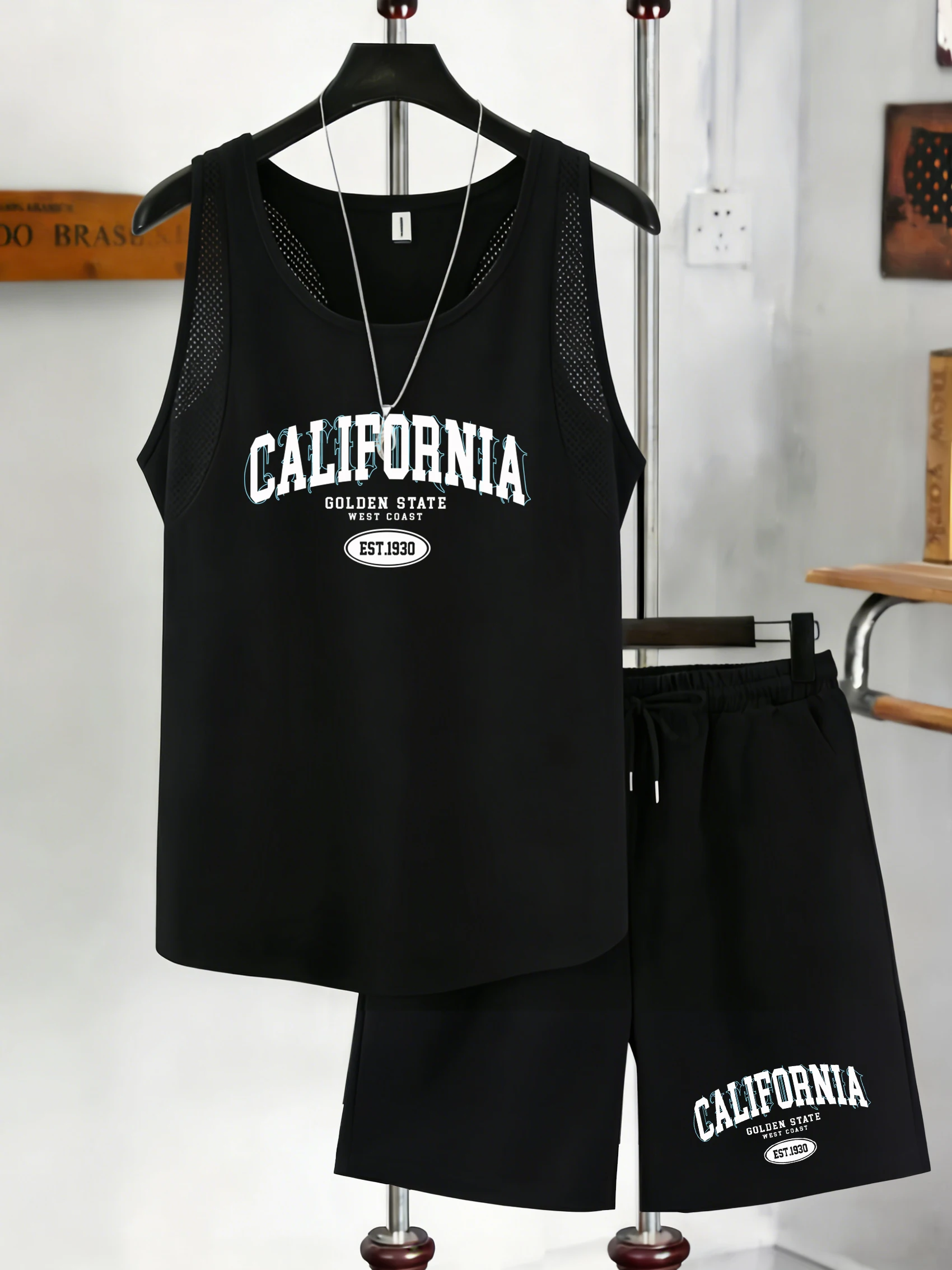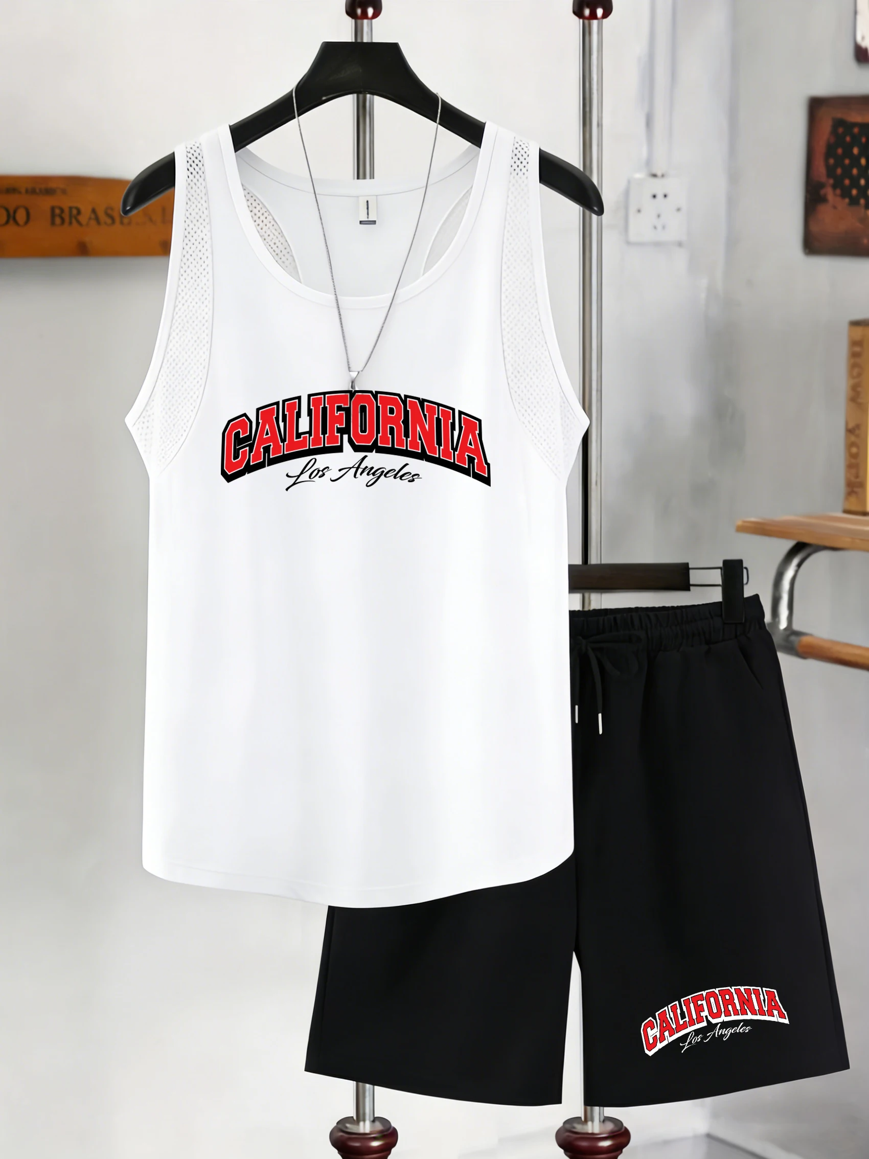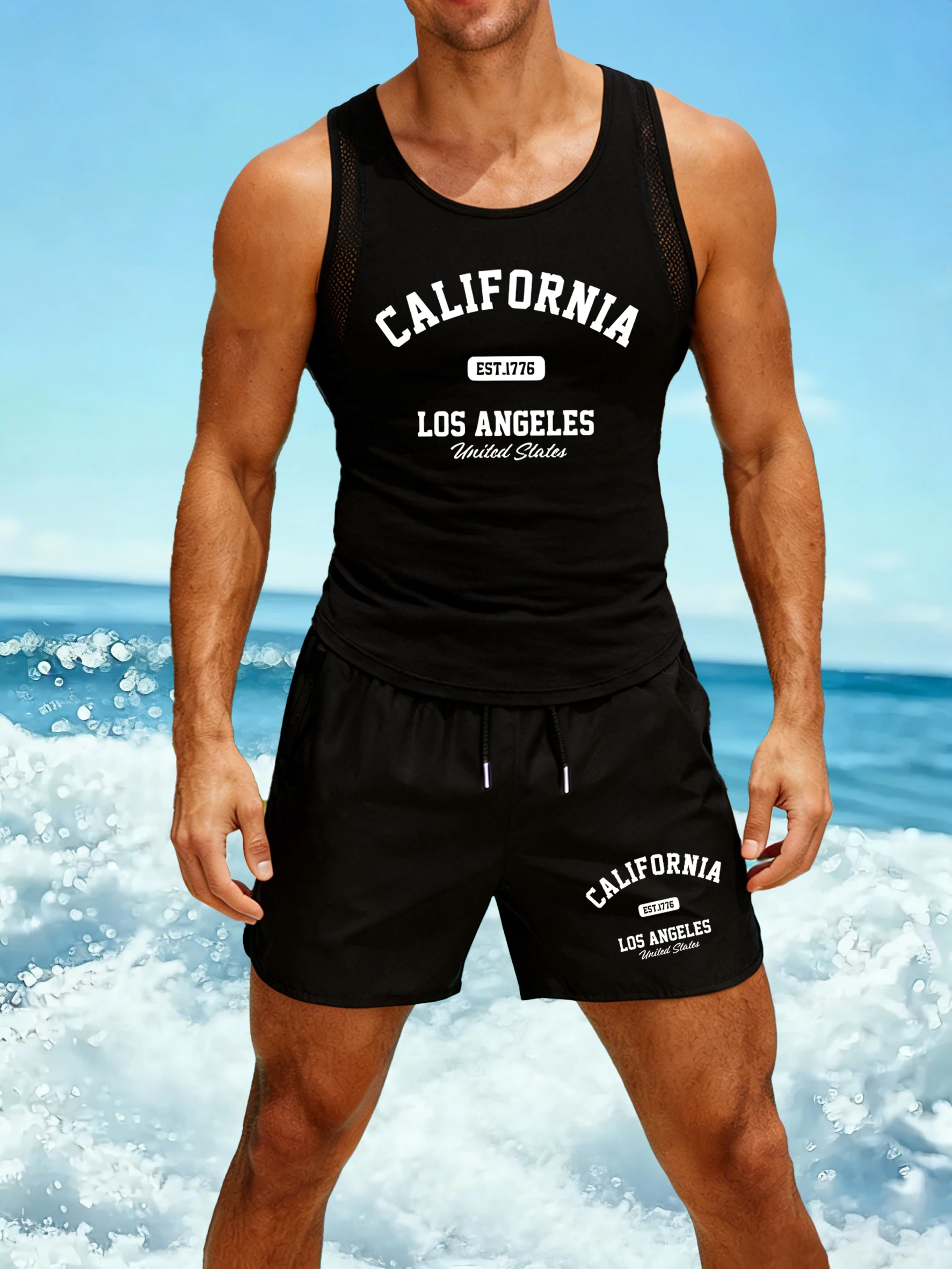 California Los Angeles Est 1776 Bedruckter Netzwestenanzug für Herren, modische Sommer-Shorts, weiches T-Shirt mit O-Ausschnitt, bequeme Herrenbekleidung