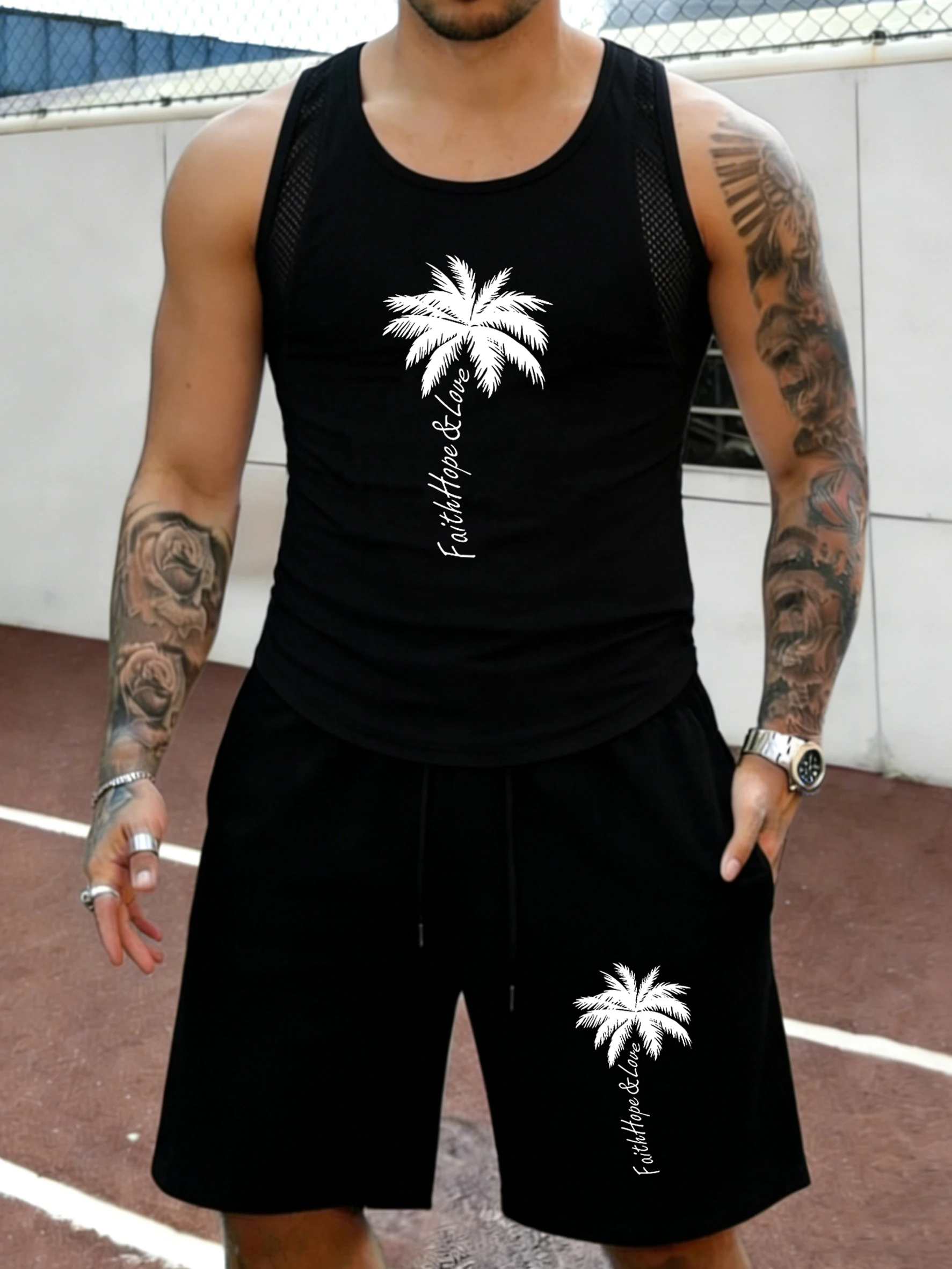 Sommerliches, atmungsaktives, schnelltrocknendes ärmelloses Oberteil und Shorts-Set für Herren. Geeignet für den Einsatz während Fitnessübungen und beim Laufen.