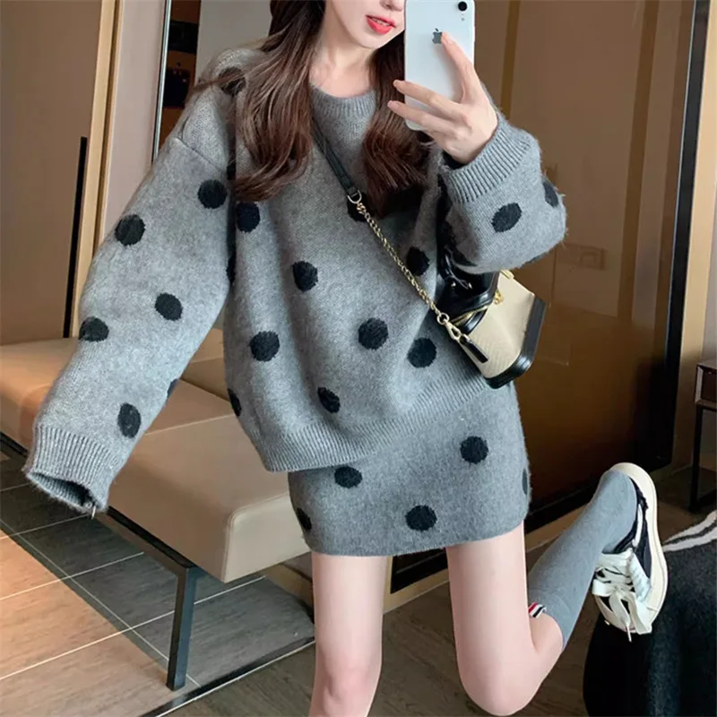 Schickes Polka-Dot-Strickset, frisches Jugend-Pullover-Set, minimalistisches A-Linien-Strickpullover-Set, gemütliches, lässiges zweiteiliges Rock-Outfit