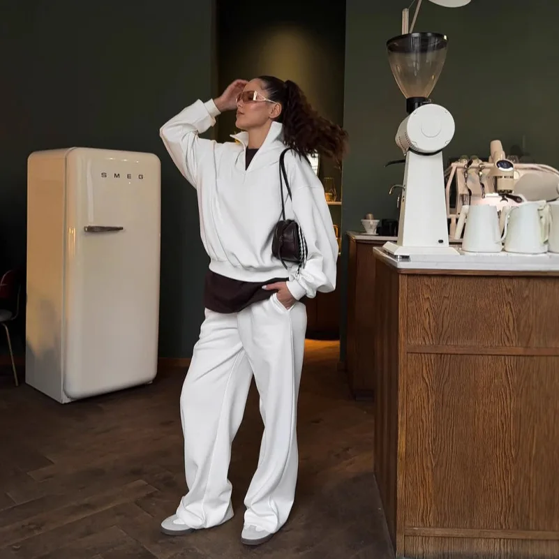 Lockerer, lässiger Strickanzug mit Stehkragen, Oversize-Pullover und weiten Hosen, dreiteiliges Outfit