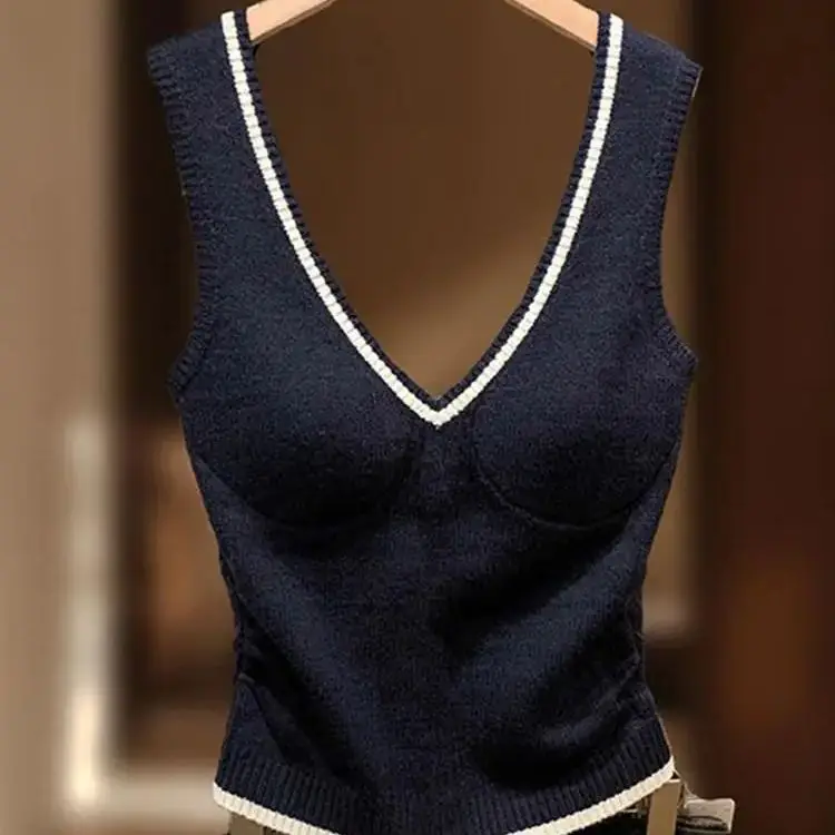 2026 Frühjahr Damen Blaues V-Ausschnitt Strick-Cami-Top Ärmellos Figurbetont Modisches Camisole Tanktop Unterhemd Ärmelloses Oberteil