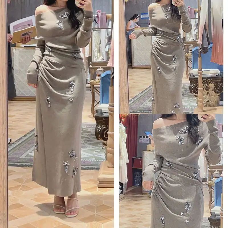 Elegantes Strick-Set, Figurbetontes Freizeit-Strick-Set, Asymmetrischer Schulter-Pullover, Ultra-Hohe Taille Outfit