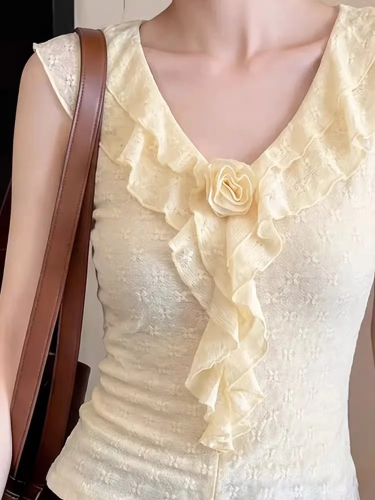 2026 Sommer Neu Aprikosenfarbenes Rüschen-Tanktop für Damen – Einzigartiges Designer-Oberteil, elegant, schlicht, schmal geschnitten, ärmellos, modisch, einfarbig, lässig