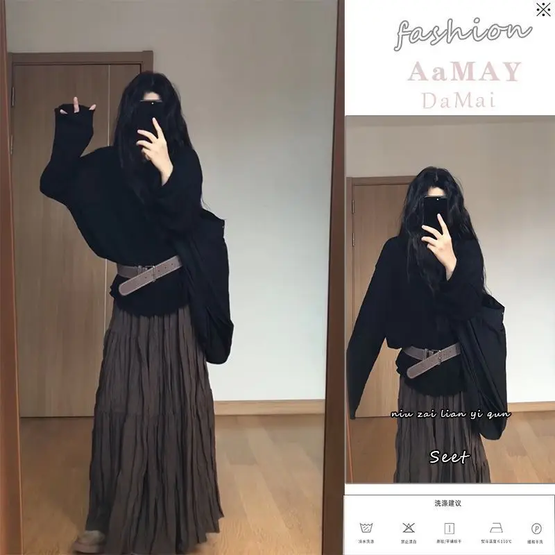 Lounge-Set Übergroßes Schwarzes Pullover-Set Langarm Strickset Plissiertes Drapiertes Midi-Ensemble für Damen Herbst Schickes Zweiteiler