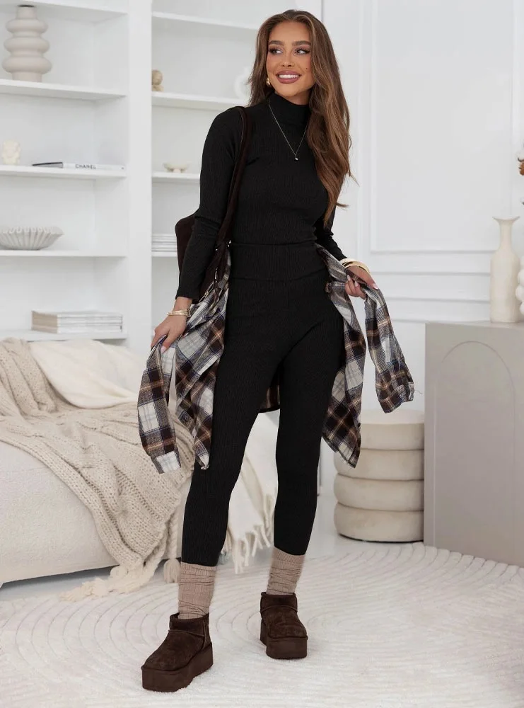 Rollkragen-Strickset Slim Fit Glattes Gestricktes Set Thermisches Geripptes Stretch-Strickwaren-Set Pullover Leggings Gemütliches Zweiteiler-Outfit