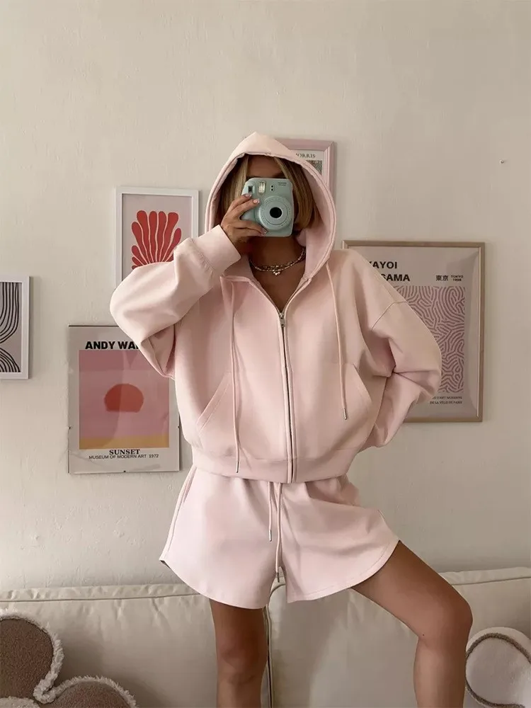 Frühlings- und Herbst-Matching-Sets für Damen: Entspannendes Baumwoll-Hoodie-Set mit kurzem Reißverschluss-Hoodie + farblich passende gerade geschnittene Hose mit Kordelzug