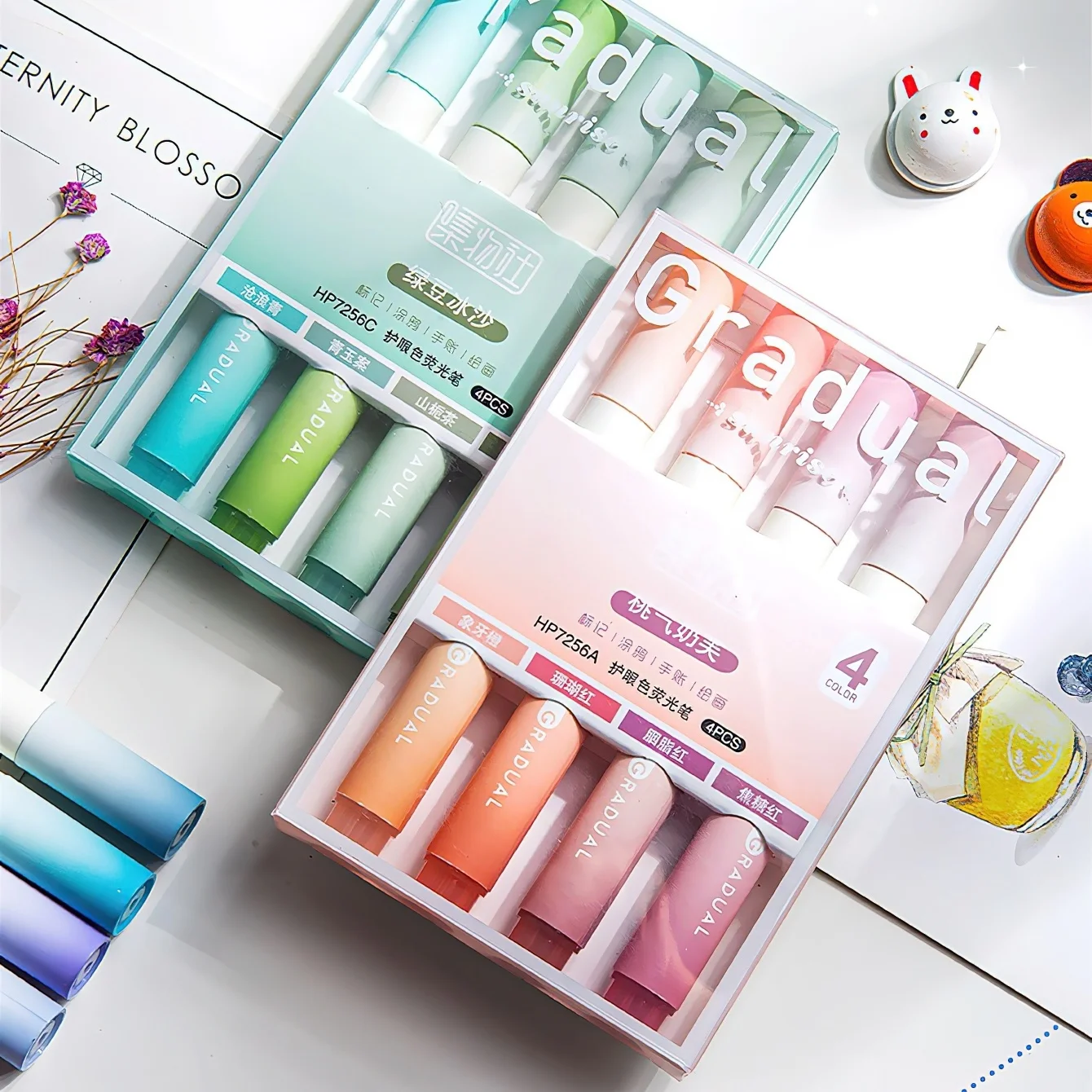 4-teiliges Textmarker-Set, Sommer-Mildfarben, Gradual Sunrise Spot Liner Marker zum Zeichnen, Malen, Büro, Schule, A7160