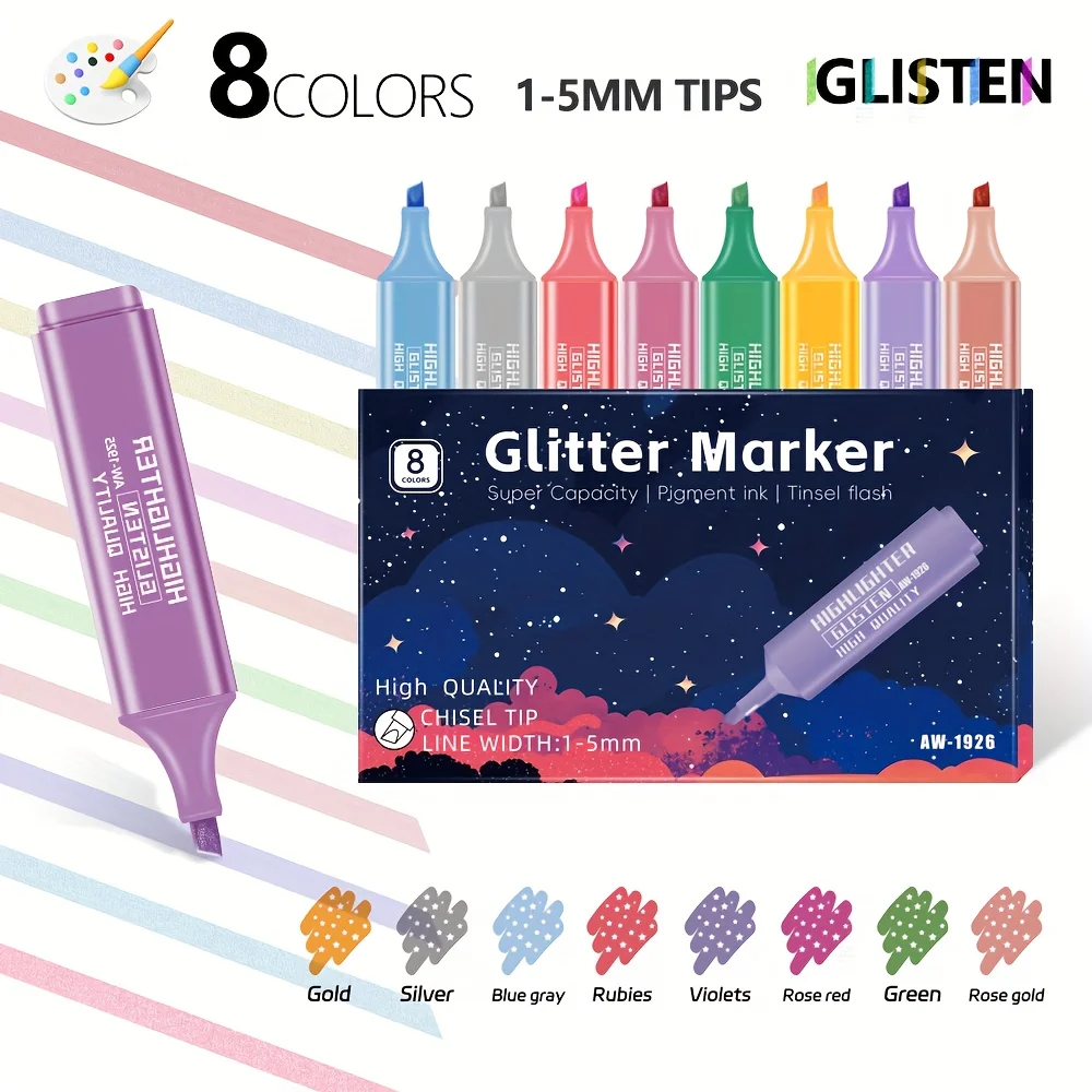 8-Farben Metallic Glitzer Textmarker-Set Schimmernde Fluoreszierende Spot-Liner Schnelltrocknend & Wischfest Schreibwaren A3248