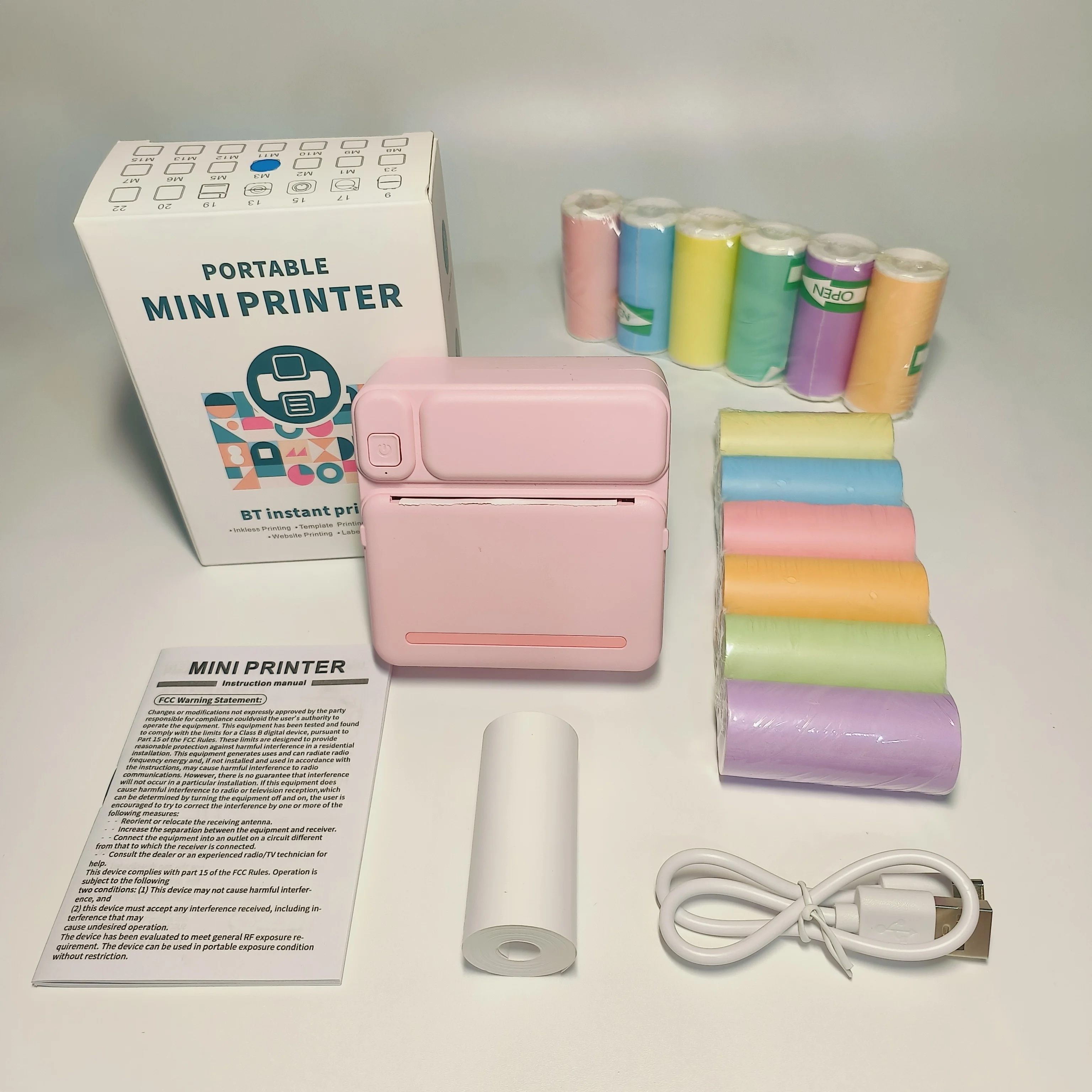 Tragbarer kabelloser Thermodrucker für iPhone und Android – 6 Farbpapierrollen und 6 Aufkleberrollen im Lieferumfang enthalten, USB wiederaufladbar, Ink-F