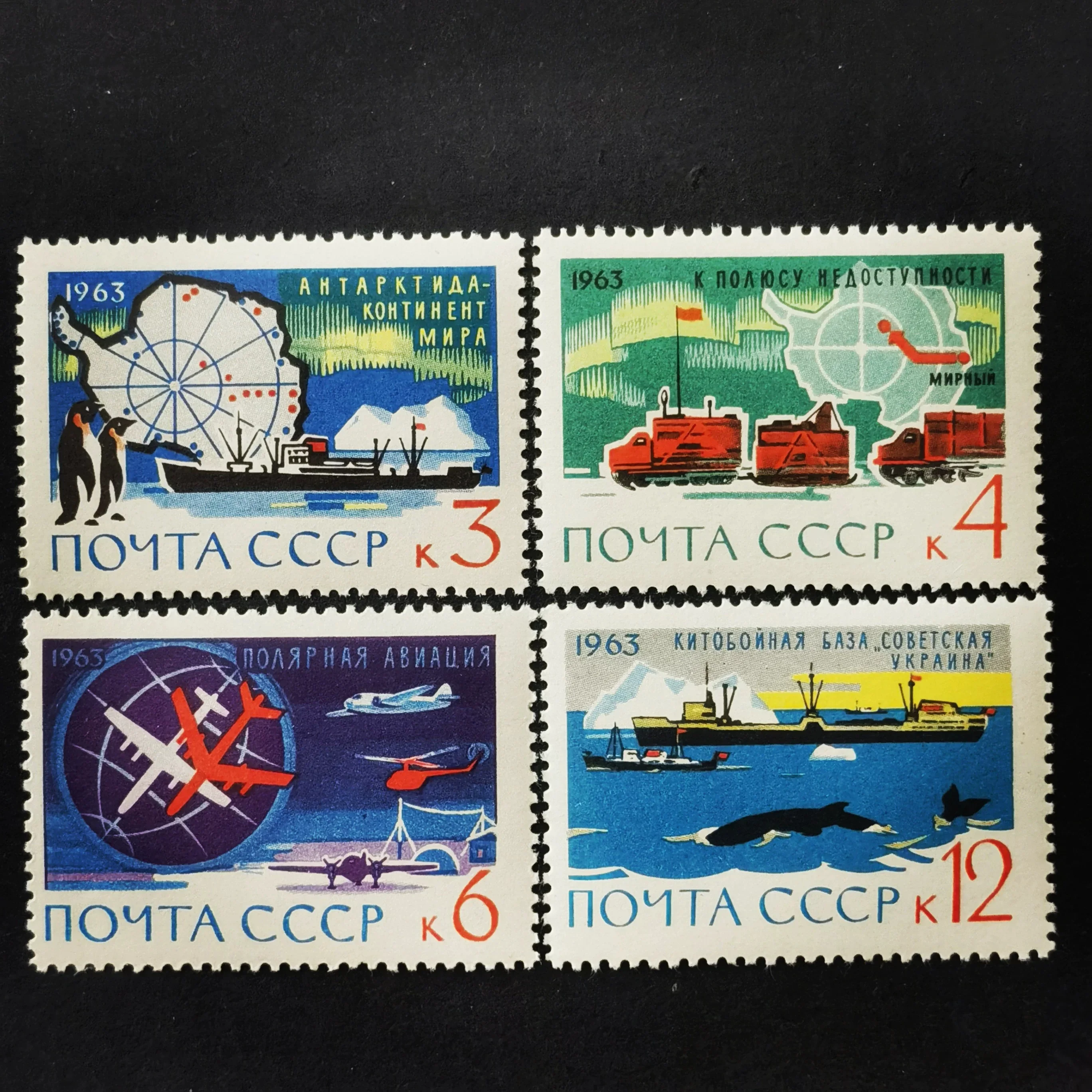4 Stück/Set neue Poststempel der UdSSR, CCCP, 1963, Antarktische Karte, Flugzeuge und Schiffe, Briefmarken, neu, ohne Verschlag